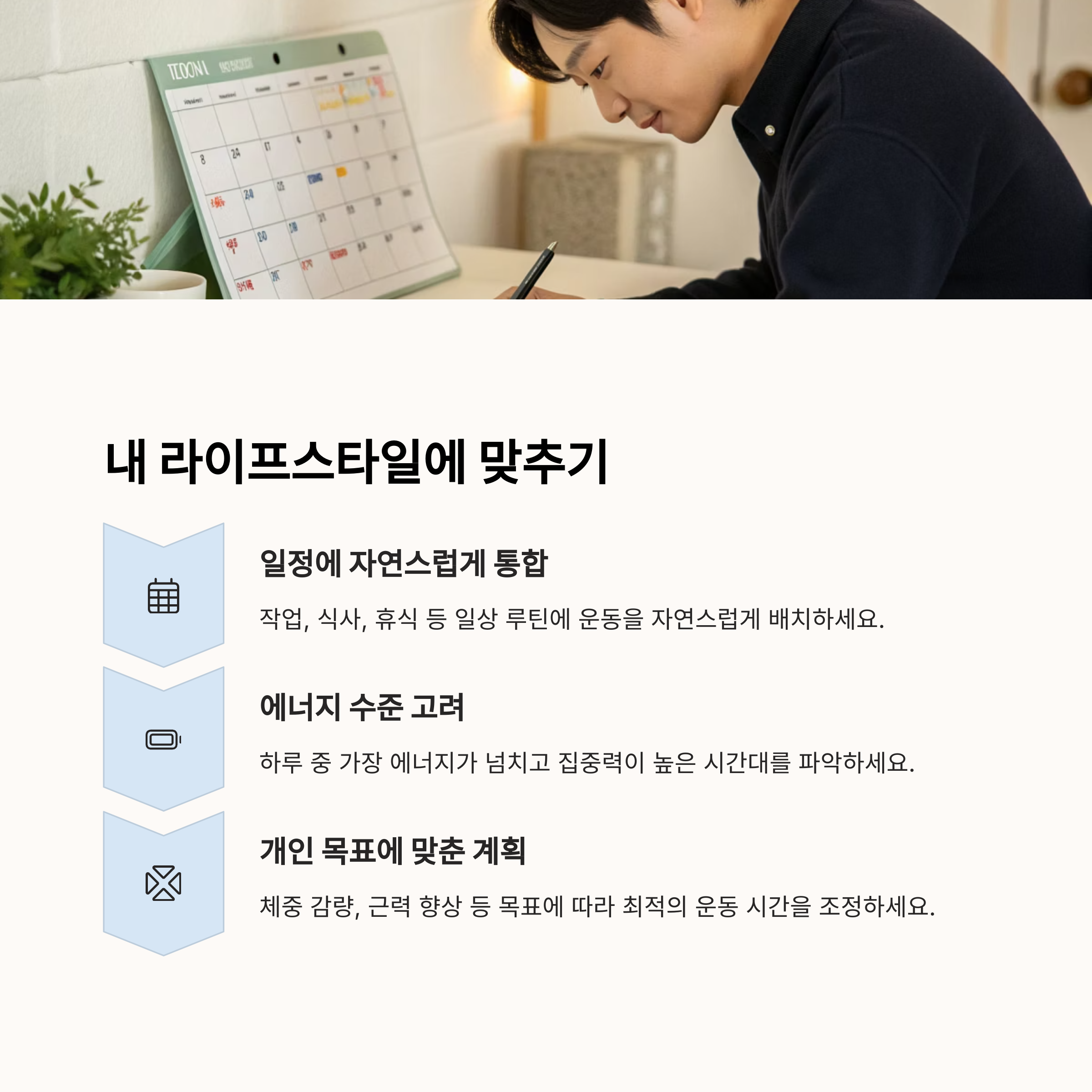 가장 중요한 건 나에게 맞는 시간대입니다. 몸이 덜 피곤하고, 꾸준히 실천 가능한 시간이 바로 최고의 운동 타이밍입니다.
