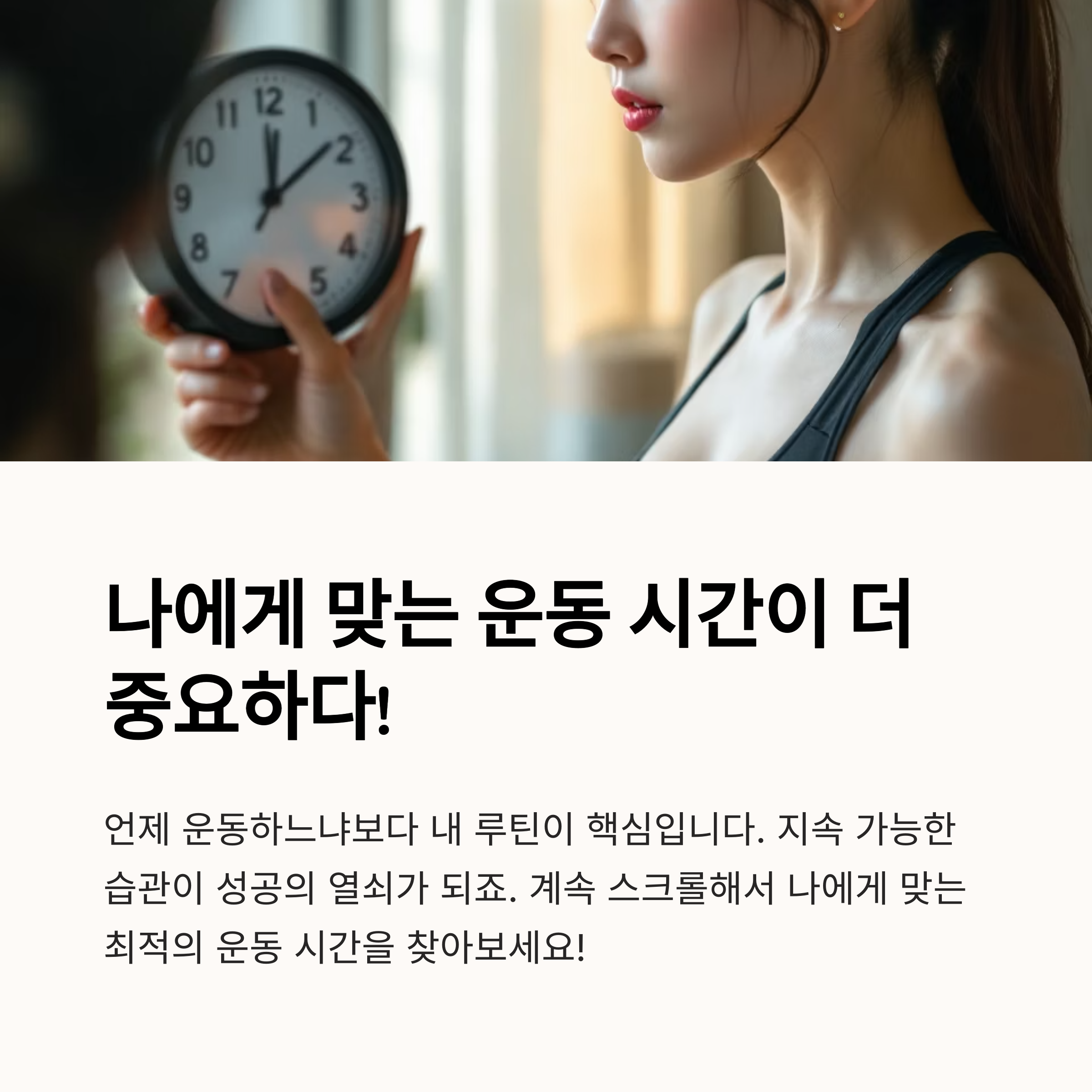 운동 시간은 개인의 생활 패턴과 컨디션에 따라 달라져야 합니다. 아침이든 저녁이든, 중요한 건 그 시간에 내 몸이 얼마나 잘 반응하고 얼마나 꾸준히 지속할 수 있느냐입니다. 남들과 비교하기보다, 내 리듬에 맞춘 루틴을 하나씩 만들어보세요. 그게 진짜 운동의 시작입니다.