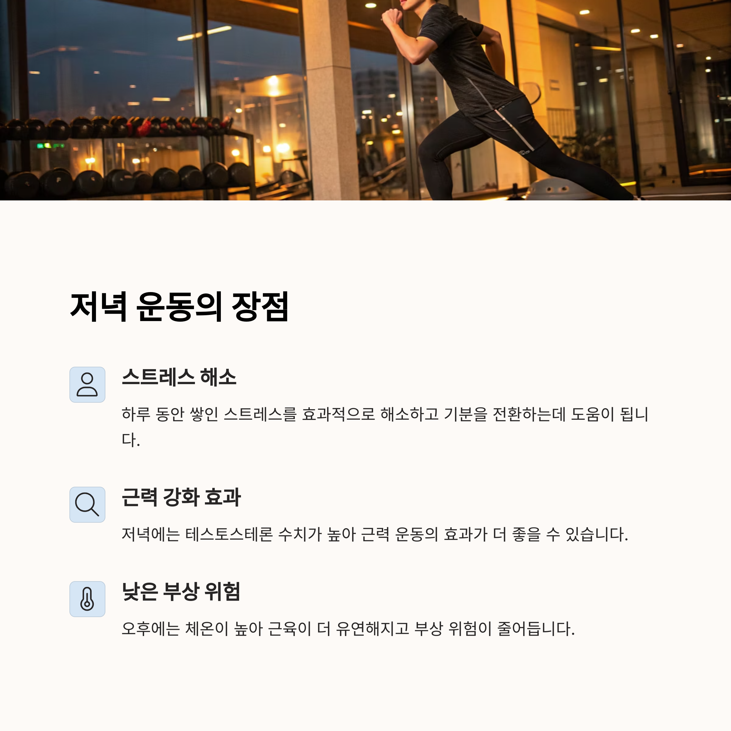 | 저녁 운동 | 체온이 높아져 운동 효율이 오르고, 스트레스 해소에 도움됩니다. |