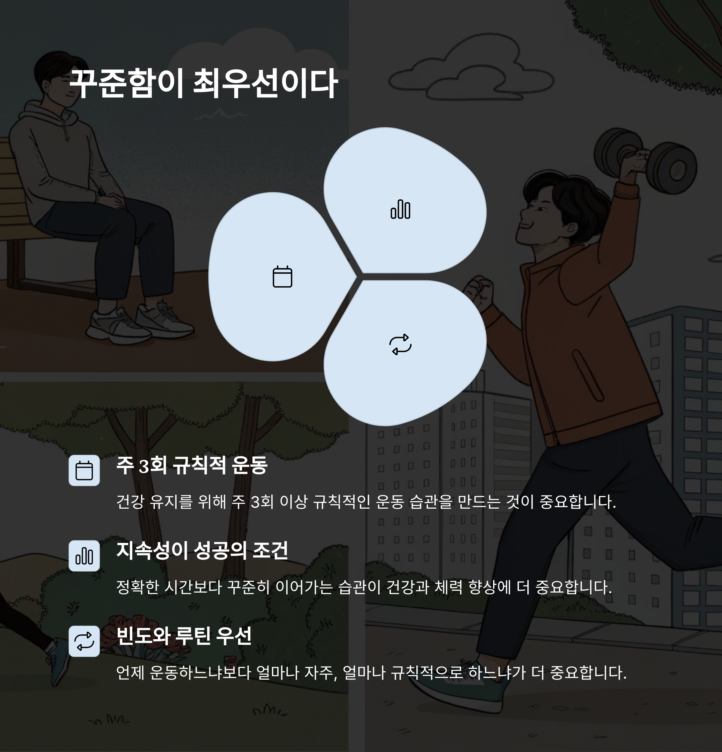 정해진 운동 시간이 정답은 아닙니다. 나의 생활 패턴, 피로도, 집중력이 더 높은 시간대를 찾아 지속 가능한 루틴을 만드는 것이 핵심입니다. 꾸준히 할 수 있는 시간, 피하지 않고 실천할 수 있는 시간이 가장 좋은 운동 시간입니다.
