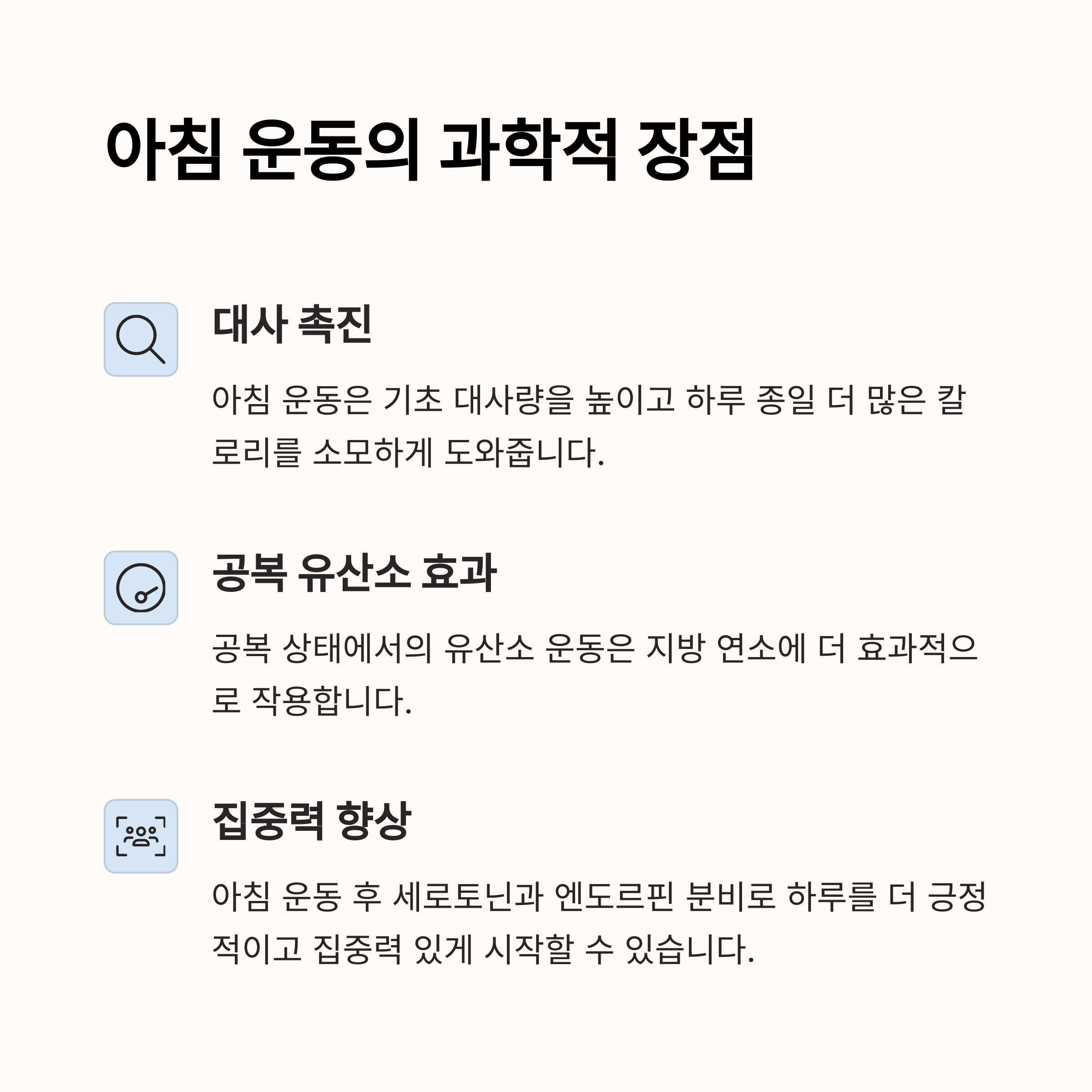 | 대사율 상승, 공복 유산소 효과 | 근력 향상, 집중력 상승, 스트레스 완화 | 꾸준히 실천 가능한 시간대에 맞추기 |