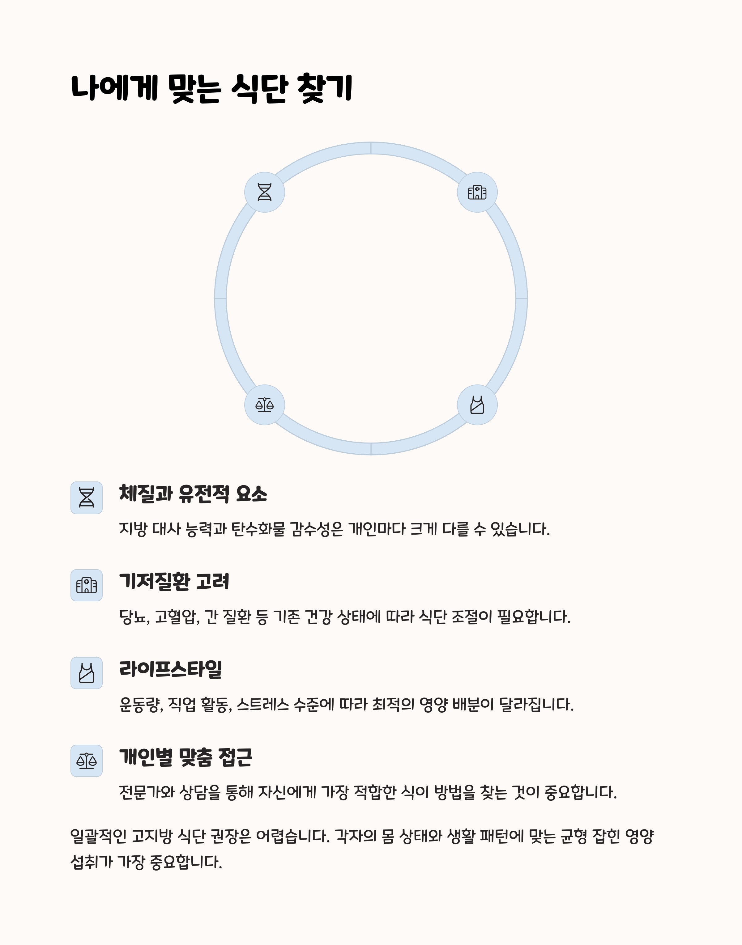 고지방 식단은 단기간에 변화가 느껴질 수 있지만, 모든 사람에게 맞는 만능 다이어트는 아닙니다. 개인의 건강 상태와 생활 패턴에 따라 결과가 다르며, 지속 가능성과 안전성을 꼭 고려해야 합니다. 내 몸의 변화를 예민하게 관찰하며 유행이 아닌 내 몸에 맞는 방법을 찾는 것이 진짜 다이어트의 핵심입니다.
