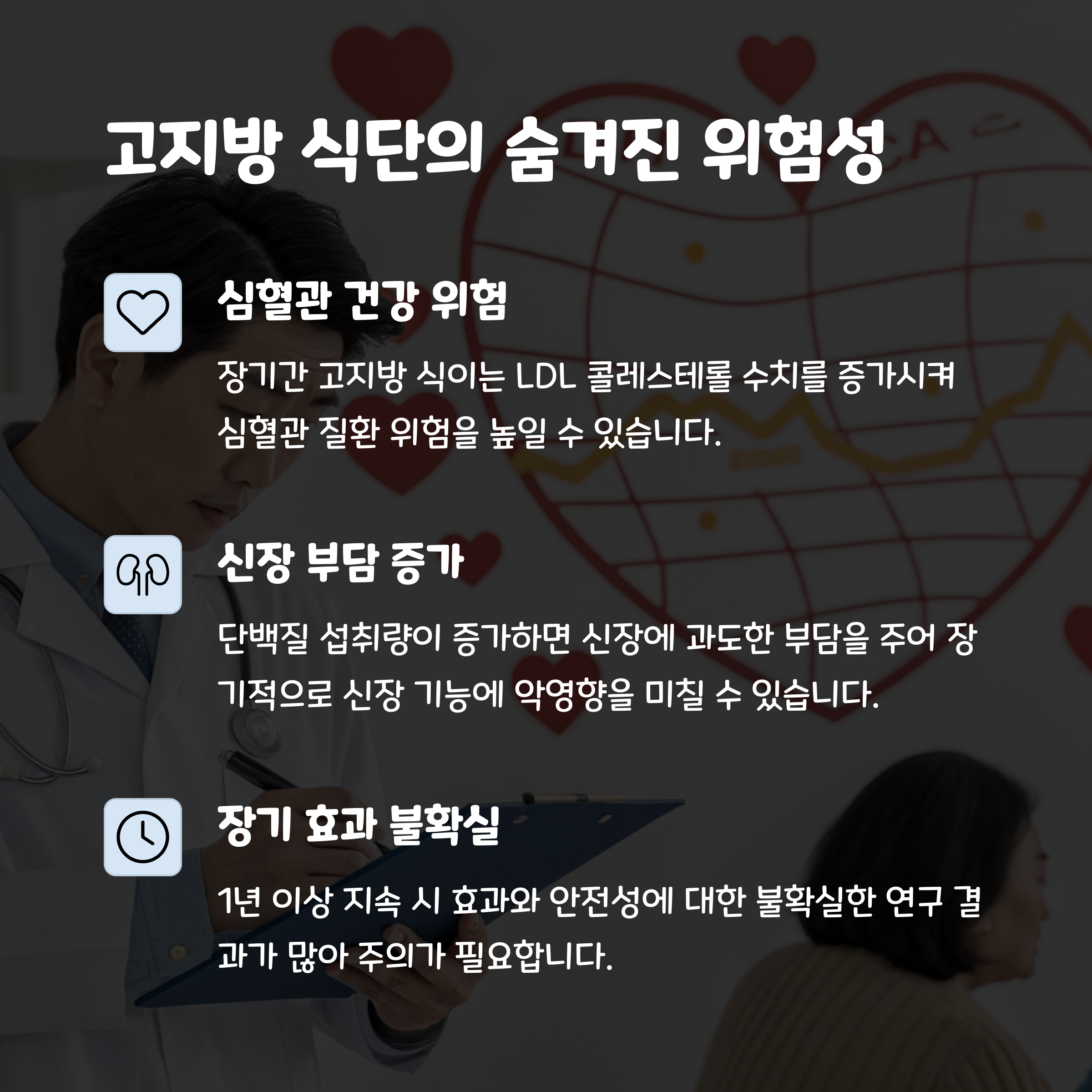 장기간 유지 시 지방간, 고지혈증, 영양 불균형 위험이 있으므로 주기적인 건강 검진과 전문가 상담이 필요합니다.