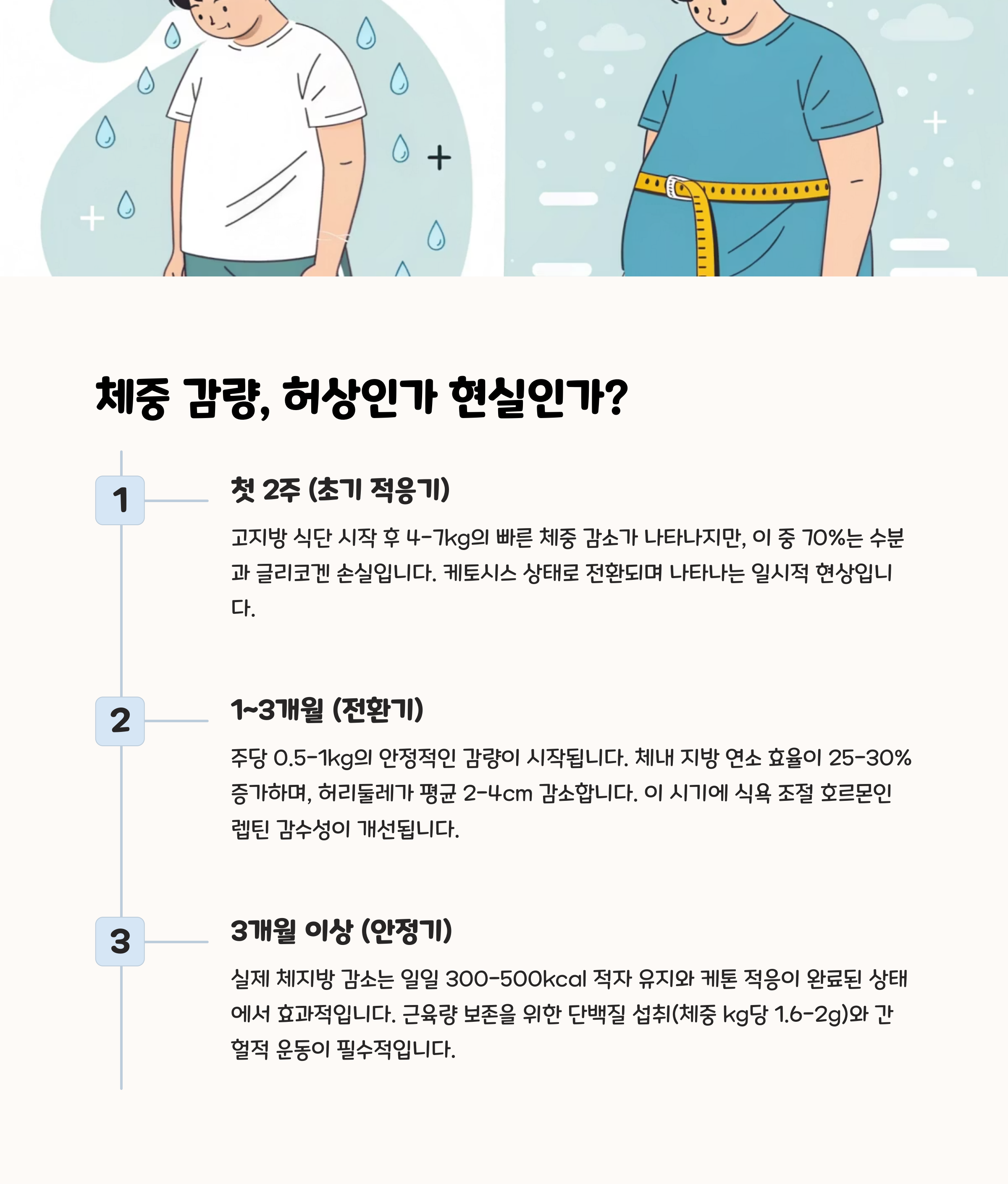 | 체중 감소 이유는? | 지방 대신 저장 탄수화물이 빠르게 소진되어 수분과 함께 체중이 줄어듭니다. |