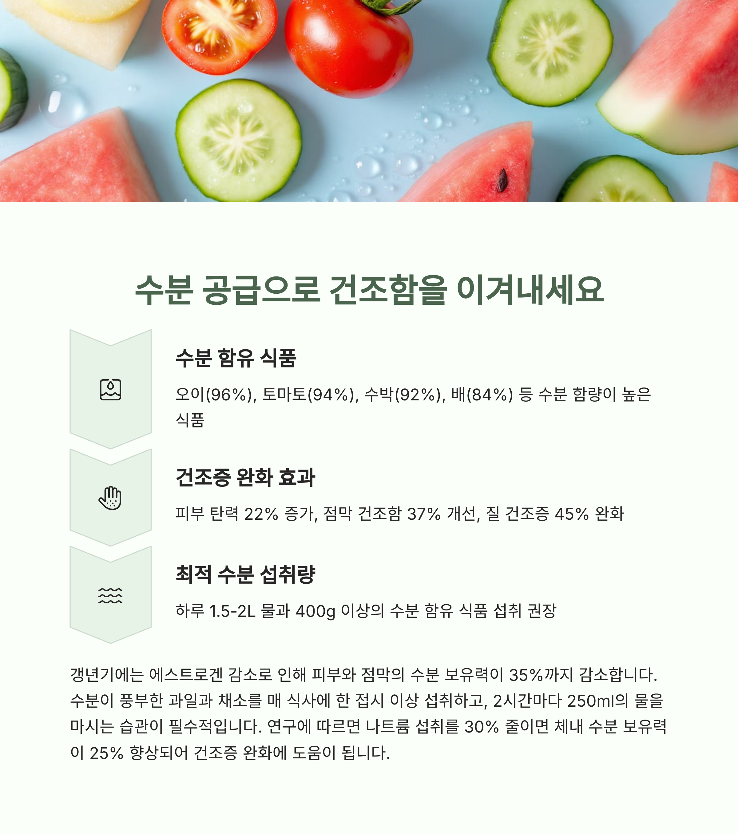 "수박, 오이, 토마토처럼 수분이 풍부한 식품이 도움을 줍니다."