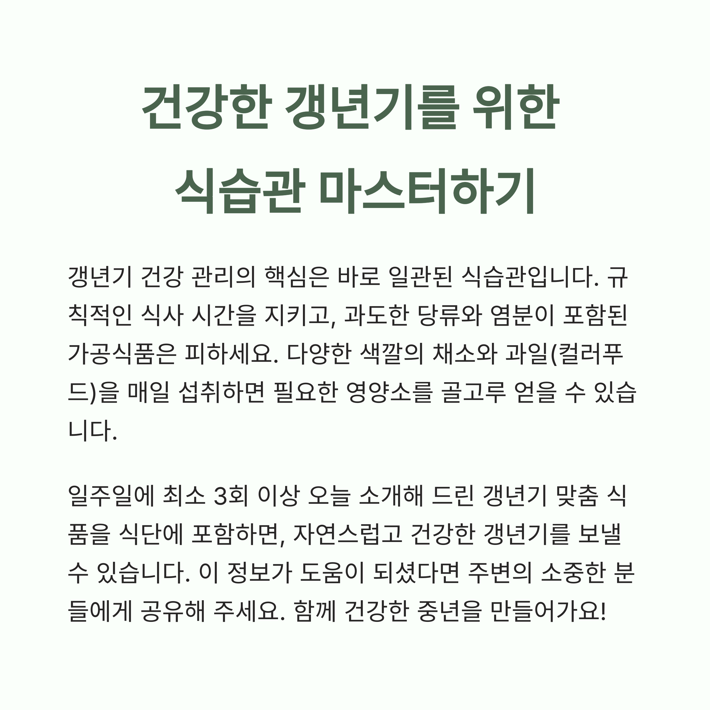"꾸준한 식습관 관리가 갱년기 증상을 완화하고 활력을 유지하는 비결입니다."