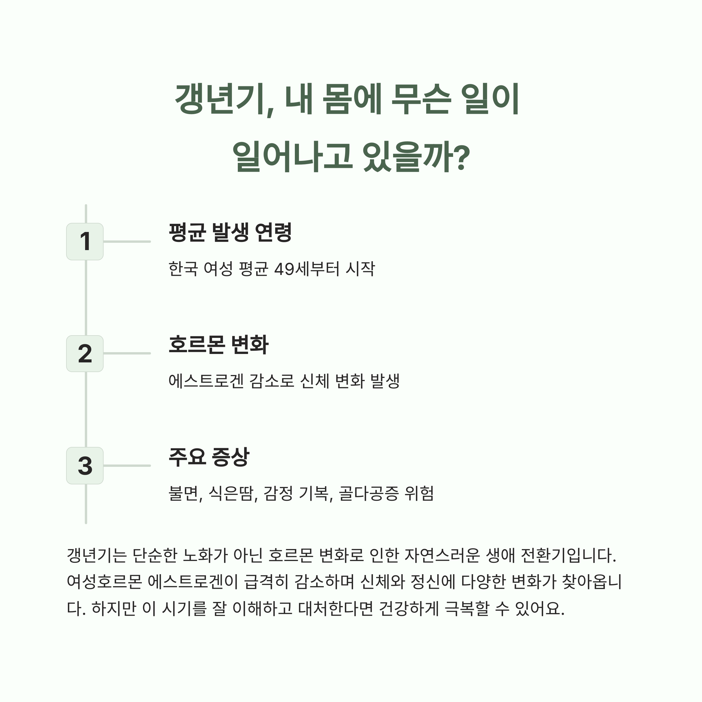 갱년기는 여성 호르몬이 급격히 감소하면서 신체와 정신에 다양한 변화가 나타나는 시기입니다.