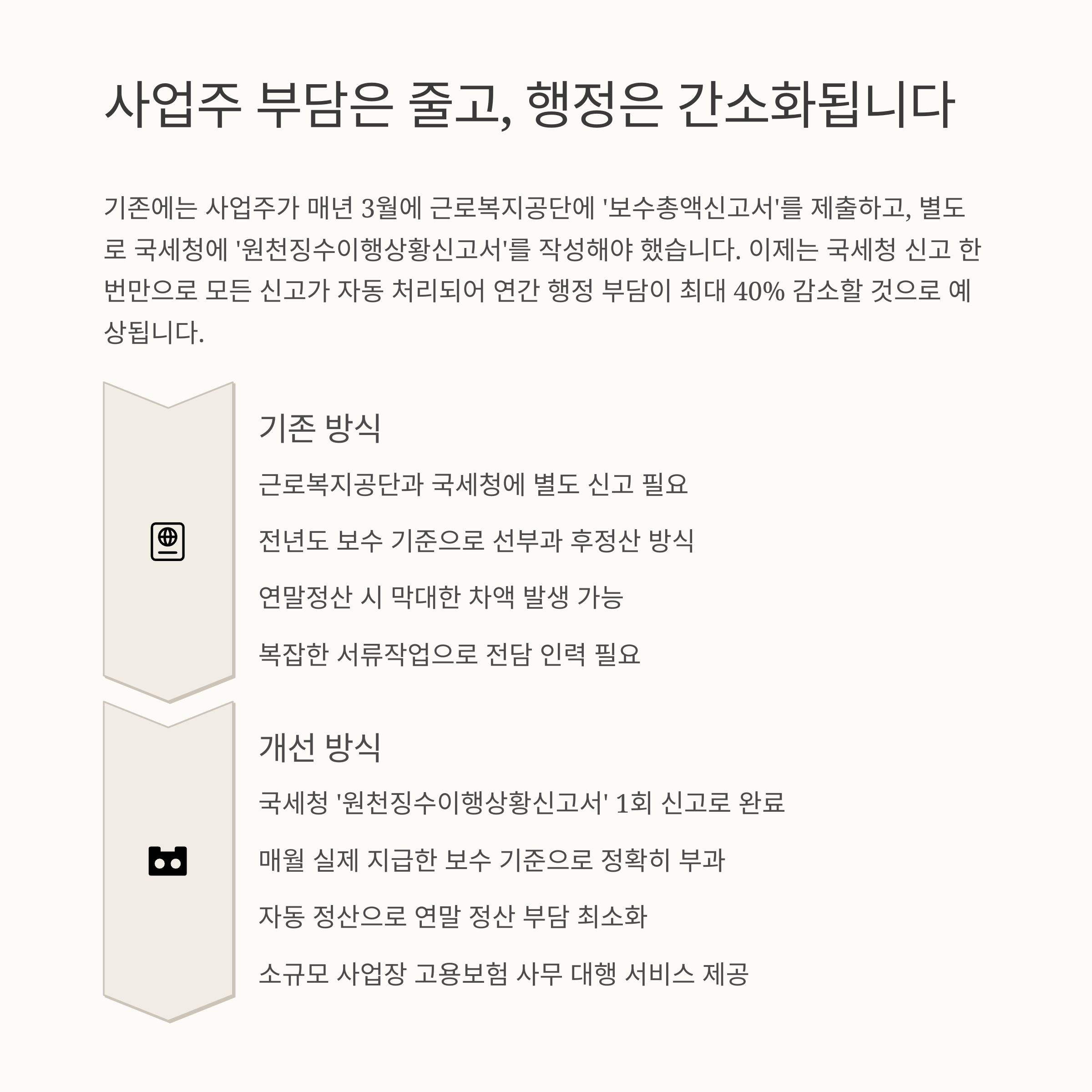 사업주 신고 국세청 + 근로복지공단 중복 신고 국세청 신고 1회로 일원화