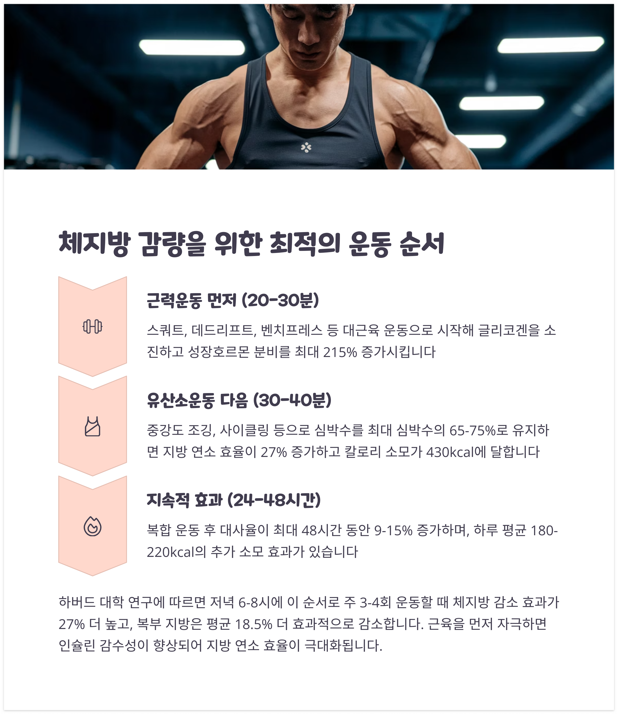 | 유산소 vs 근력 차이 | 유산소는 체지방 연소 중심, 근력은 대사량 증가 중심 → 둘 다 필요하지만 순서와 목적이 관건 |