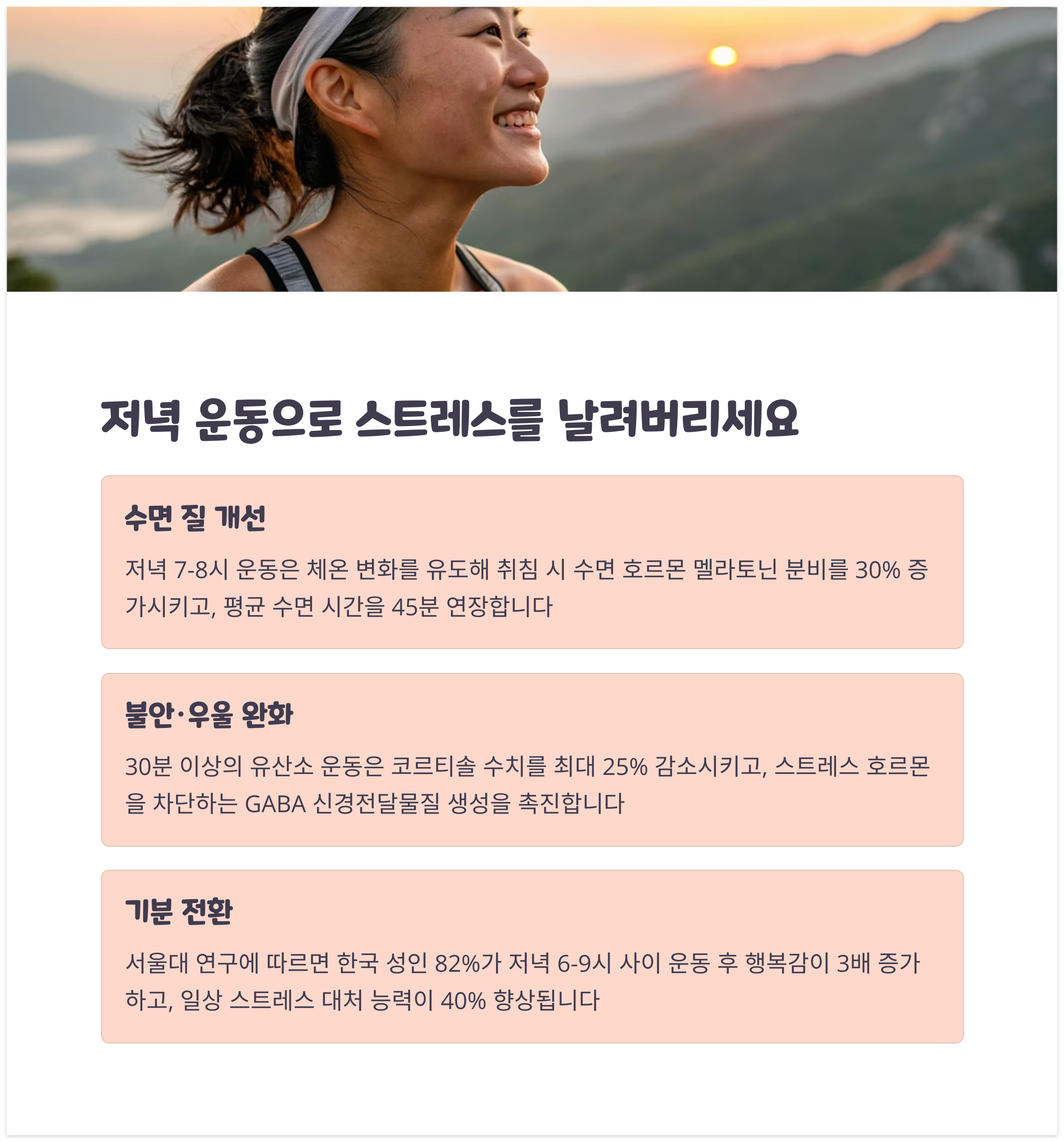 | 저녁 운동의 특징 | 체온 상승, 에너지 소비량 ↑, 스트레스 해소 ↑ → 체지방 감량에 적합한 시간 |