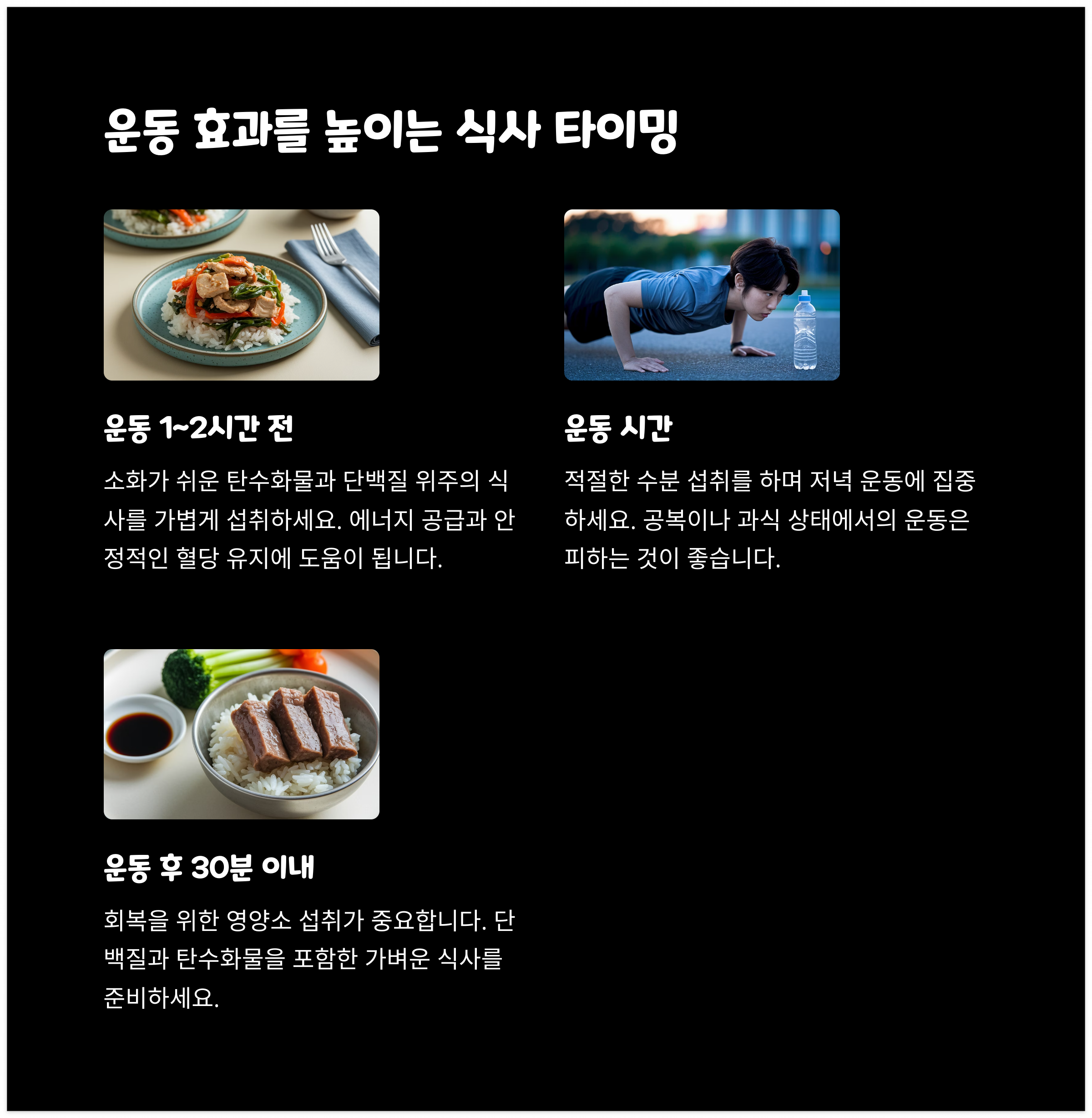 | 체지방 감량, 대사량 증가, 심폐력 향상 | 근력 후 유산소 / or 유산소 단독 (지구력 목적) | 식후 1~2시간, 무리한 공복 운동은 피하기 |