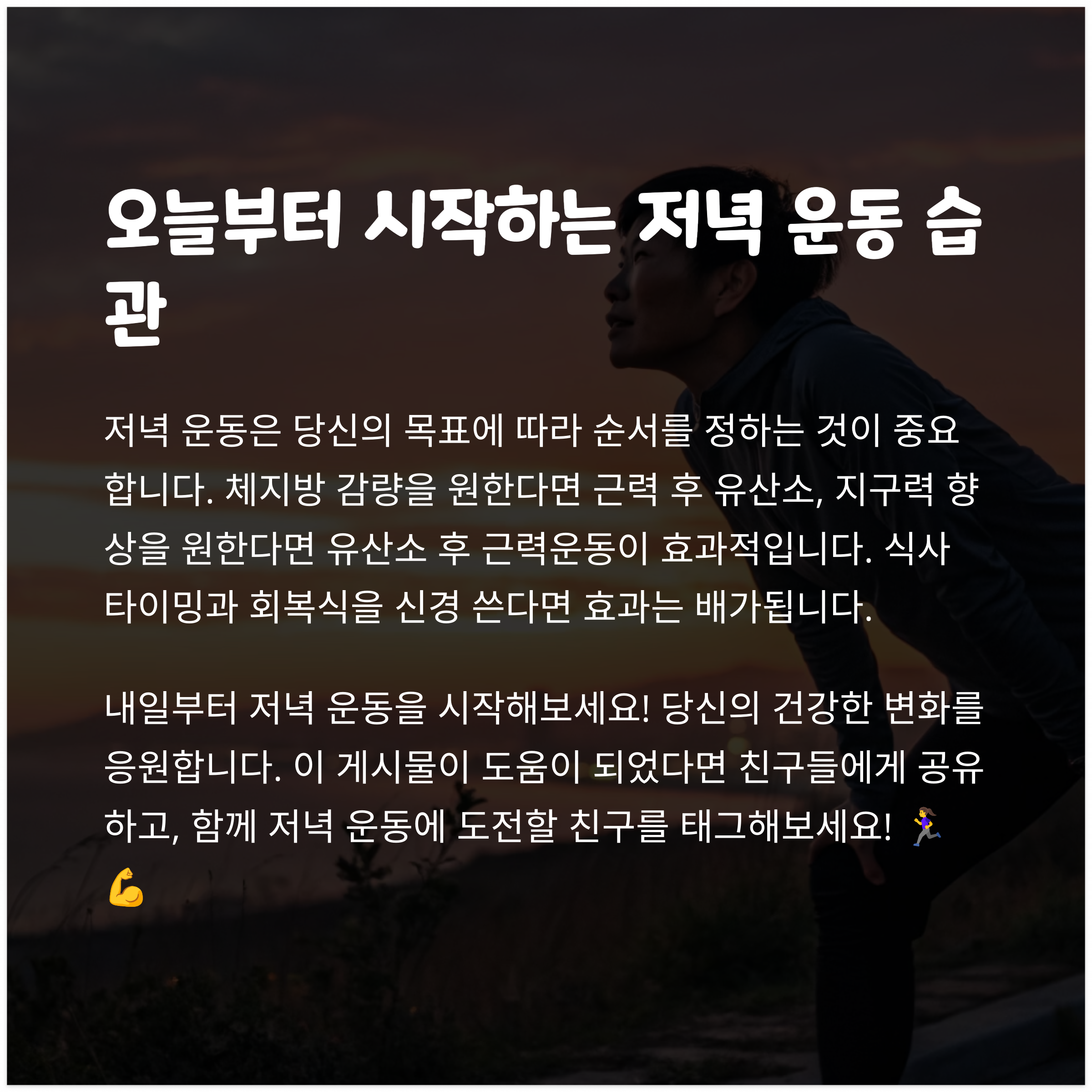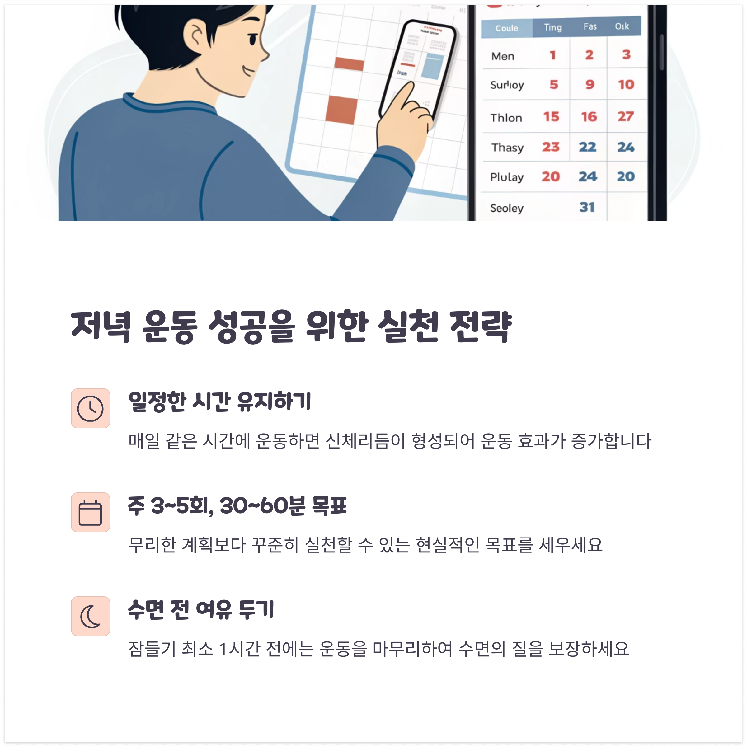 저녁에 운동할 땐 근력 30분 + 유산소 20분 또는 고강도 근력 단독 루틴이 추천됩니다. 식사 1~2시간 후, 무거운 위장을 피하고 운동 후엔 가벼운 단백질 보충과 수분 섭취로 마무리하세요. 잠들기 전엔 스트레칭과 심박 안정 루틴도 꼭 필요합니다!