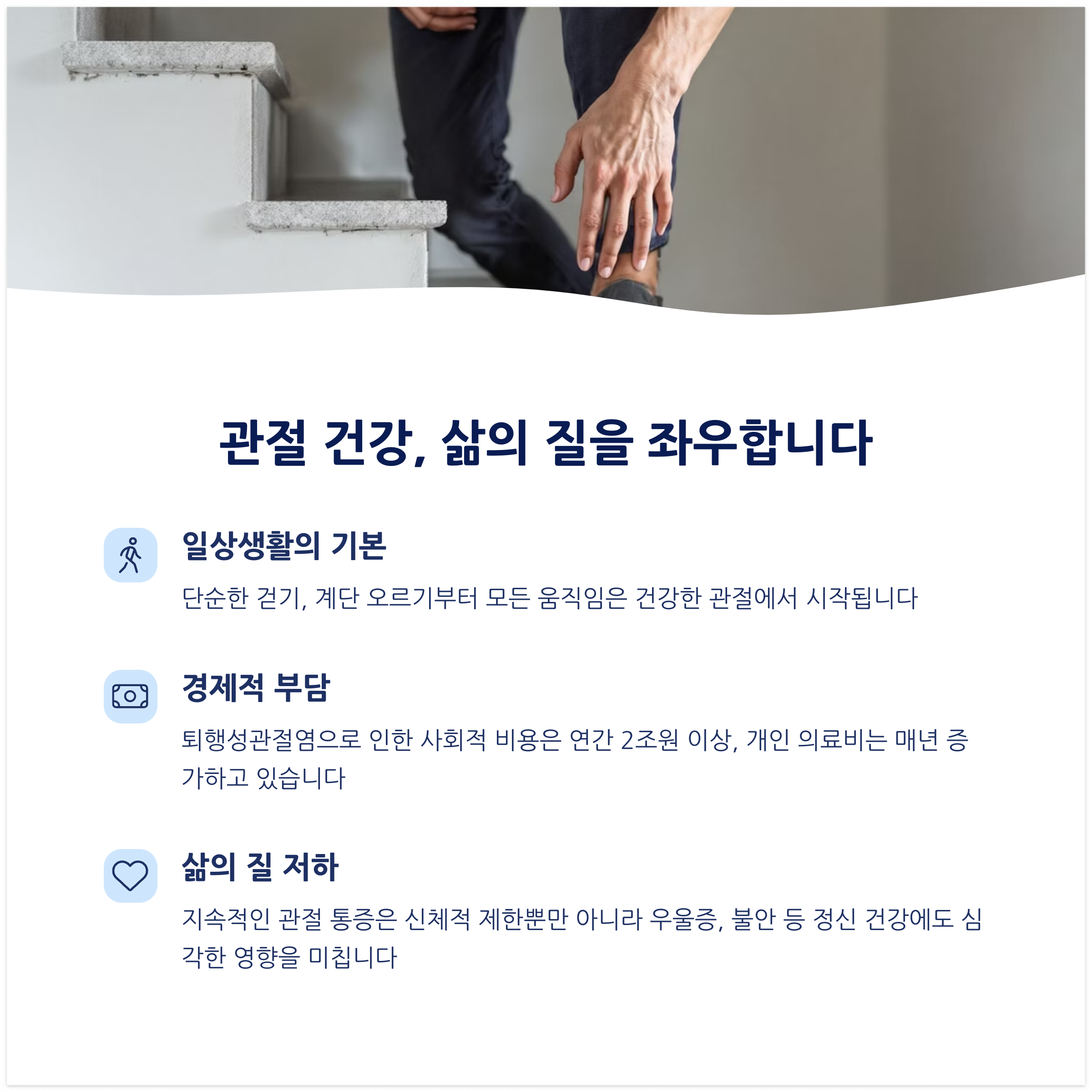 "관절이 약해지면 통증뿐 아니라 일상생활의 질이 크게 저하됩니다."