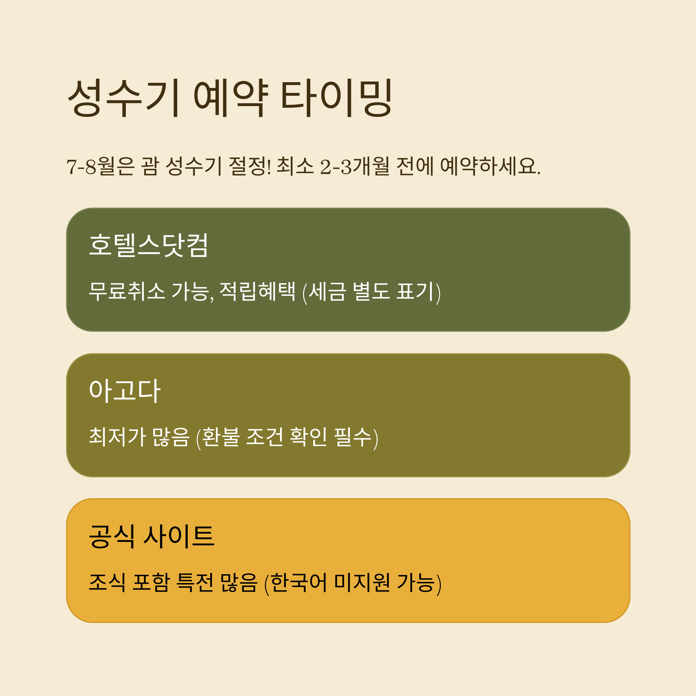 따라서 최소 **2~3개월 전에는 예약**하는 걸 추천해요.