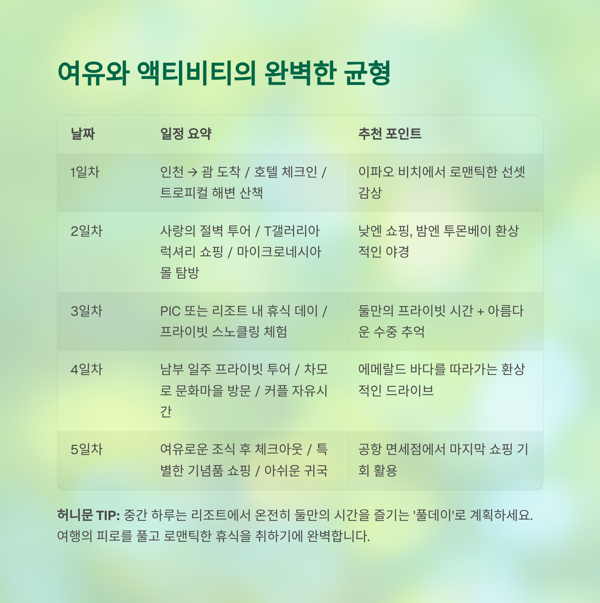 1. 일정 구성 – 여유와 액티비티가 균형을 이루는 구성