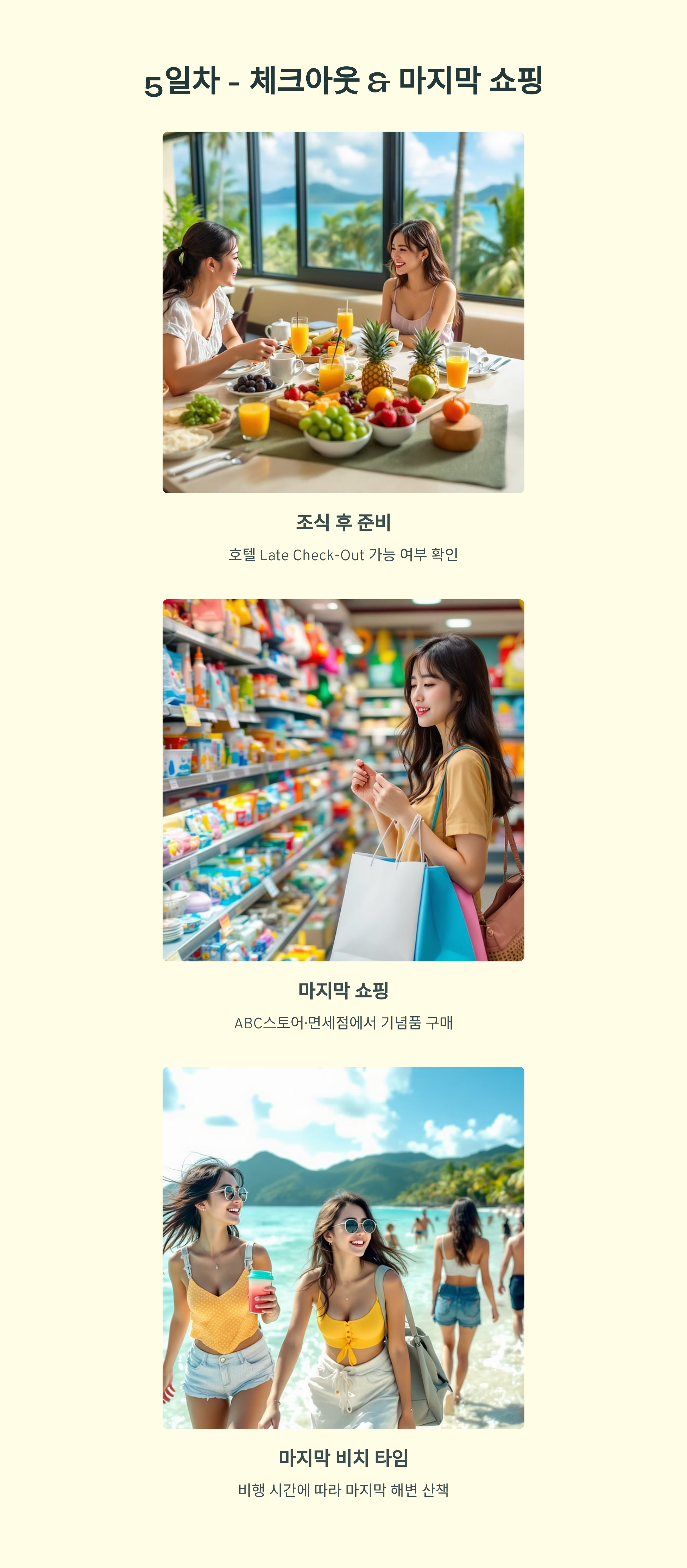 - 항공기 시간 전후에 따라 마지막 비치 산책도 가능