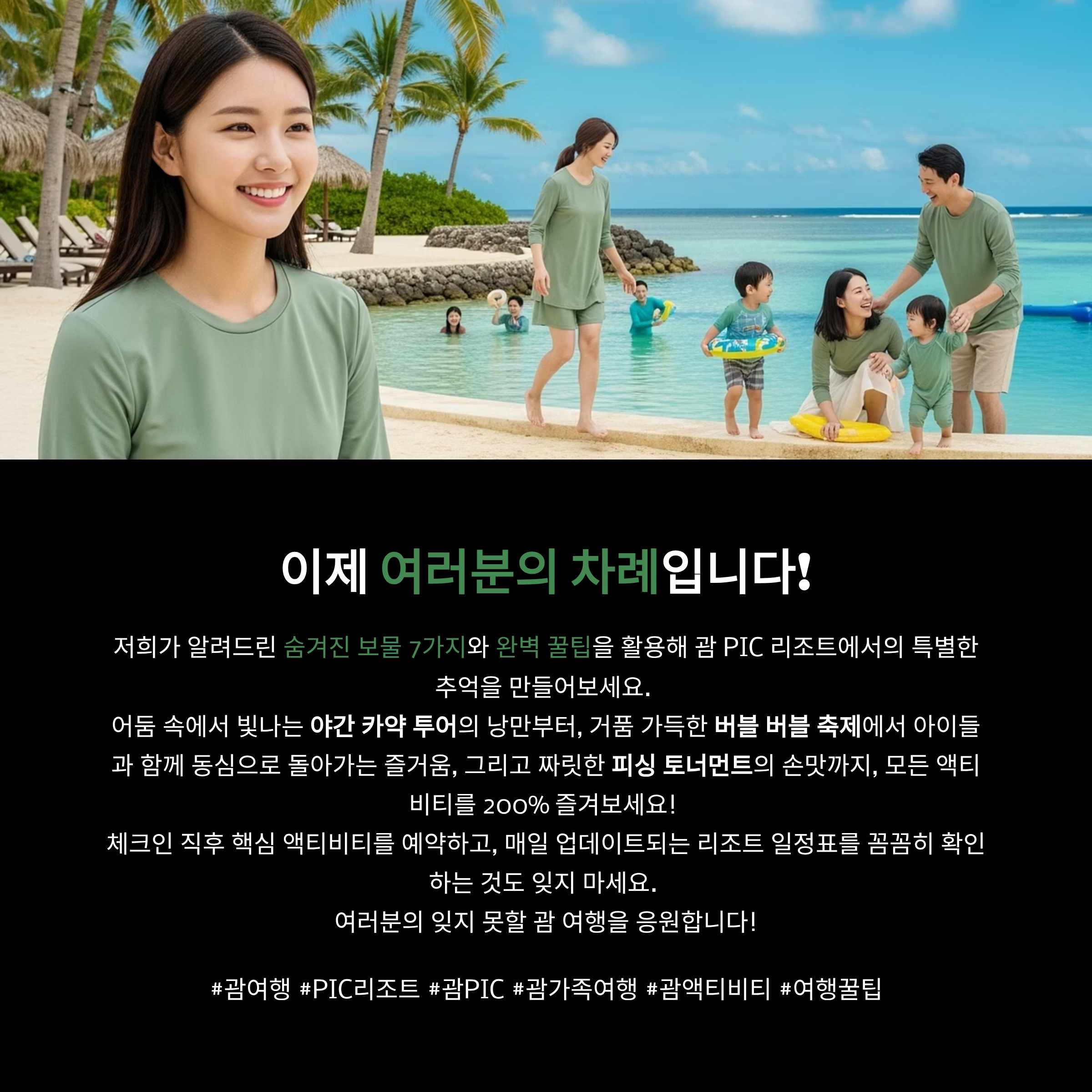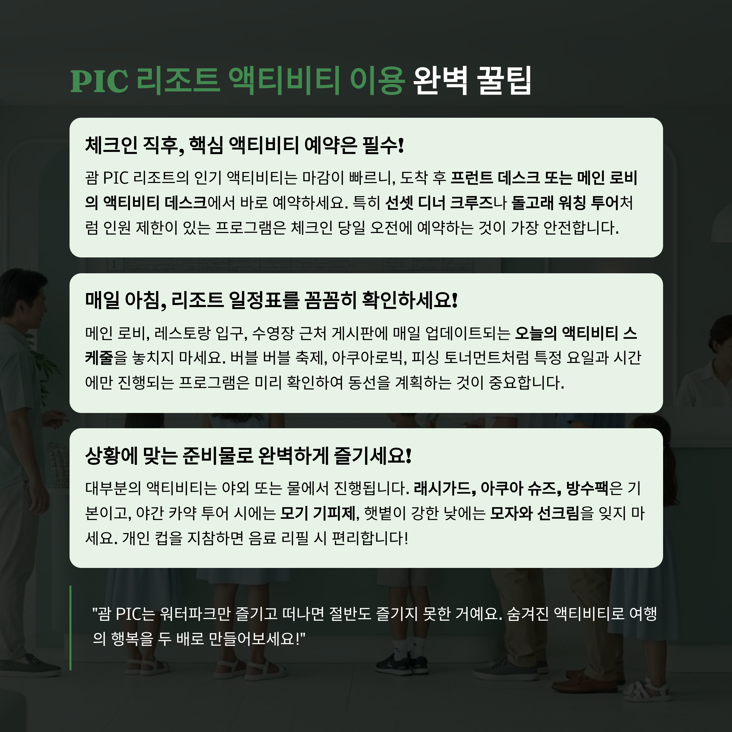 괌 PIC 리조트는 워터파크 외에도 즐길 거리가 무궁무진한 곳이에요. 오늘 알려드린 숨겨진 액티비티들을 활용해서, 여행의 행복을 두 배로 만들어 보세요! 궁금한 점이 있다면 언제든 물어봐 주세요.