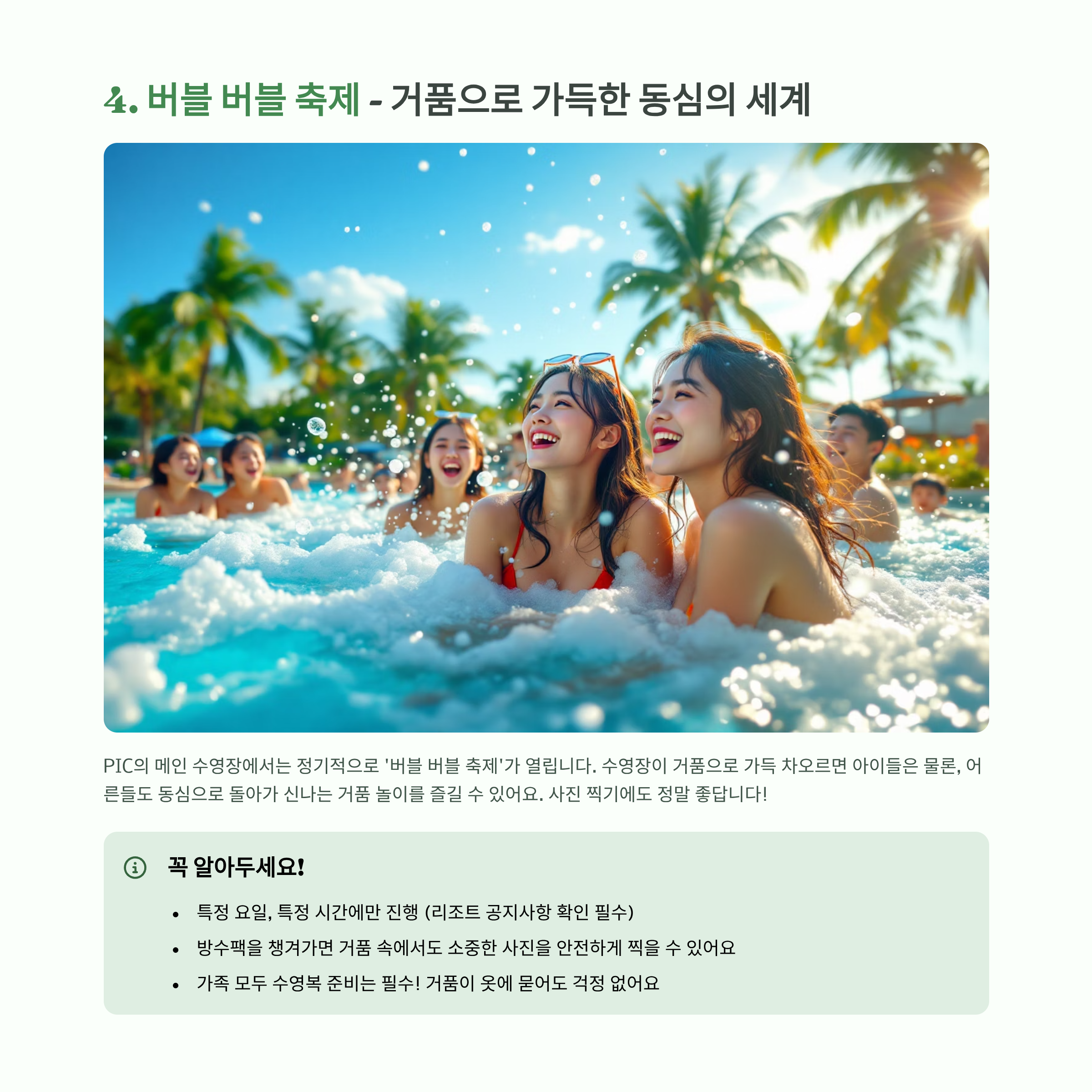 PIC의 메인 수영장에서는 정기적으로 '버블 버블 축제'가 열려요. 수영장 가득 거품이 차오르면 아이들은 물론, 어른들도 동심으로 돌아가 신나는 거품 놀이를 즐길 수 있습니다. 아름다운 배경 덕분에 사진 찍기에도 정말 좋아요.
