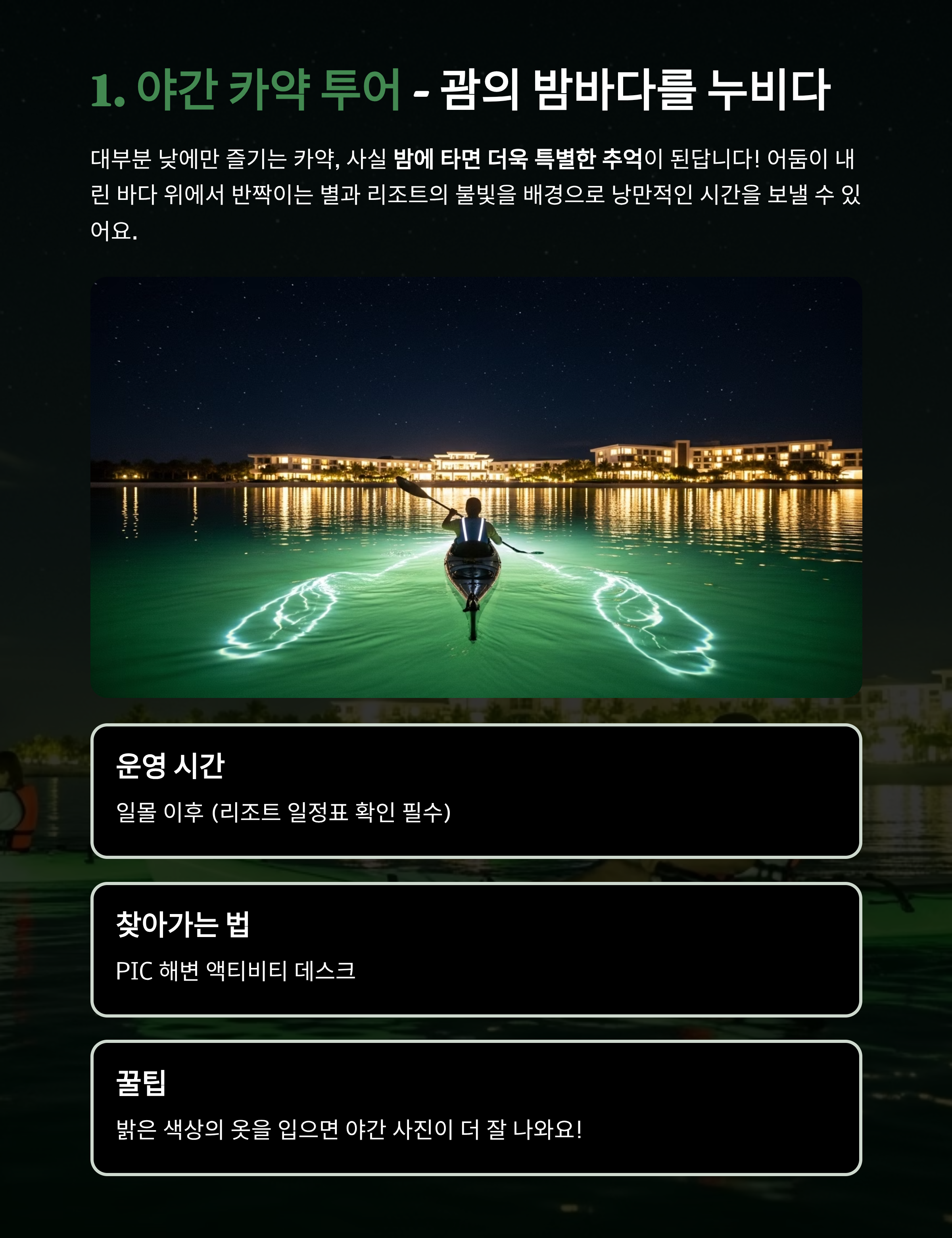 많은 분들이 낮에만 즐기는 카약, 사실 밤에 타면 더욱 특별한 추억이 된답니다. PIC의 해변에서 즐기는 야간 카약은 어둠이 내린 바다 위에서 반짝이는 별과 리조트의 불빛을 배경으로 낭만적인 시간을 보낼 수 있어요.