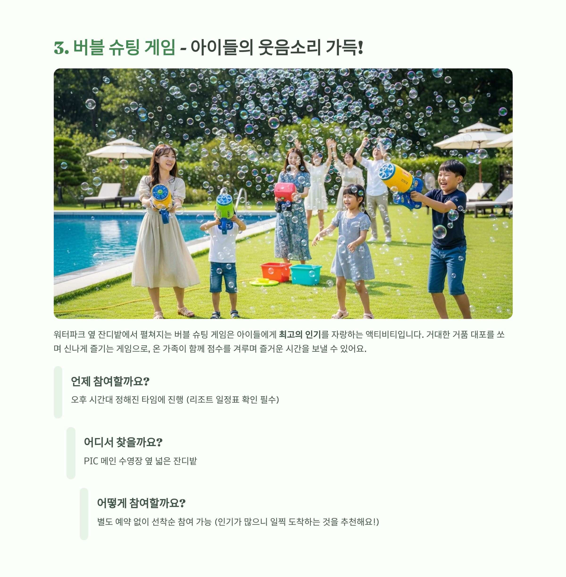 워터파크 옆 잔디밭에서 진행되는 버블 슈팅 게임은 아이들에게 가장 인기 있는 액티비티 중 하나예요. 거대한 거품 대포를 쏘며 즐기는 신나는 게임으로, 아이들의 웃음소리가 끊이지 않는답니다. 가족 모두가 함께 참여해 점수를 겨뤄보는 것도 좋은 추억이 될 거예요.