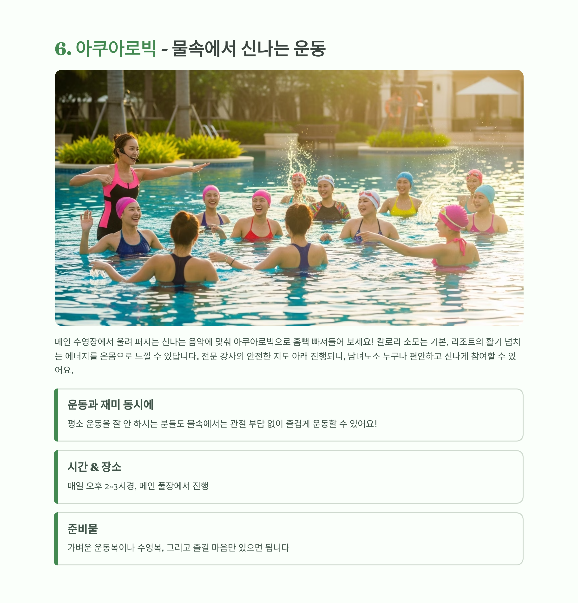 메인 수영장에서 신나는 음악에 맞춰 진행되는 아쿠아로빅은 칼로리 소모는 물론, 리조트의 활기찬 분위기를 만끽하기에 좋아요. 전문 강사의 지도 아래 안전하게 진행되니, 남녀노소 누구나 부담 없이 참여할 수 있습니다. 운동과 재미를 동시에 잡을 수 있는 숨은 보석 같은 액티비티예요.