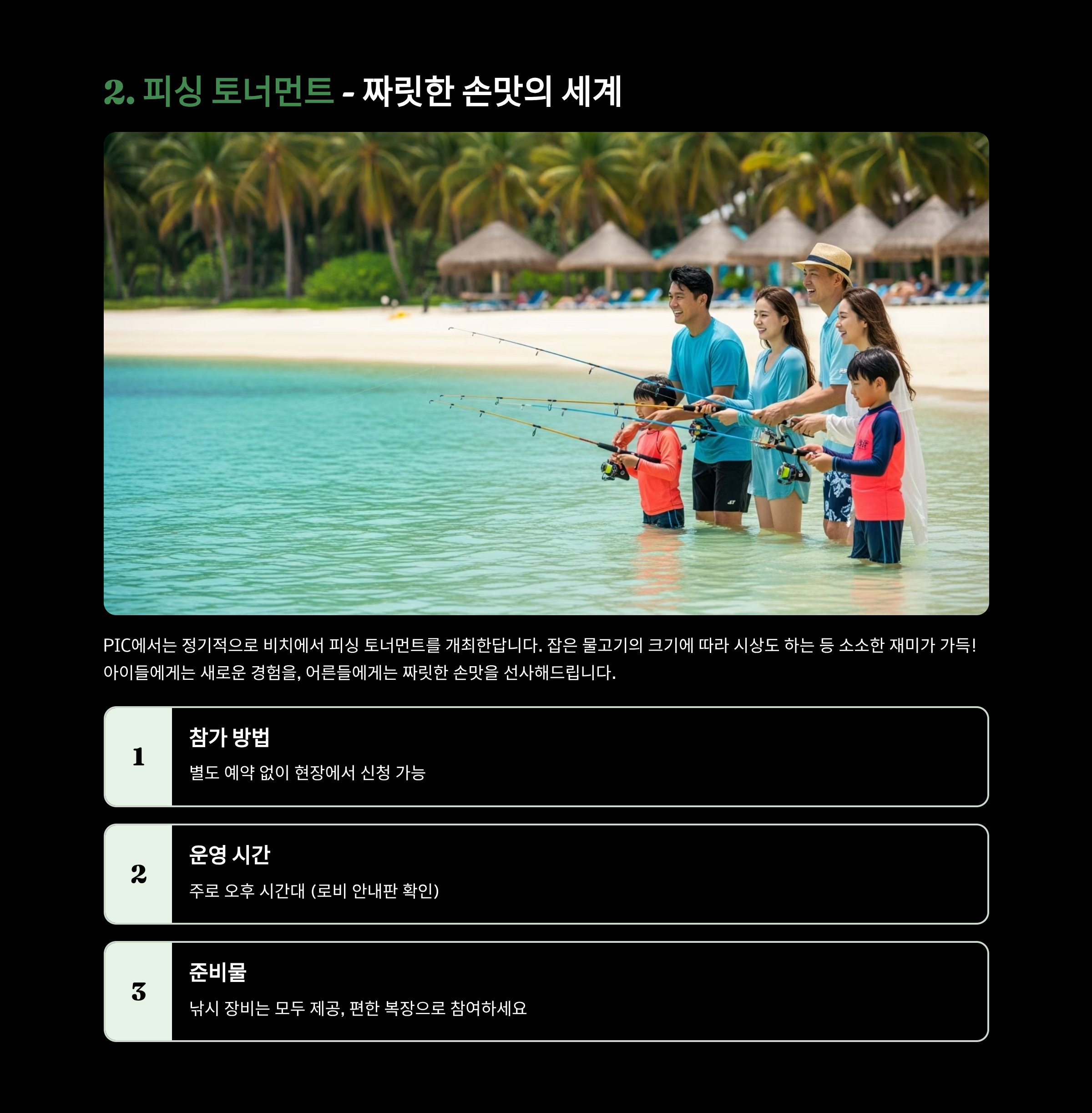 PIC는 바다낚시를 좋아하는 분들을 위해 정기적으로 피싱 토너먼트를 개최해요. 리조트 내 비치에서 진행되며, 잡은 물고기의 크기에 따라 시상도 하는 등 소소한 재미가 가득합니다. 아이들에게는 새로운 경험을, 어른들에게는 짜릿한 손맛을 안겨줄 거예요.