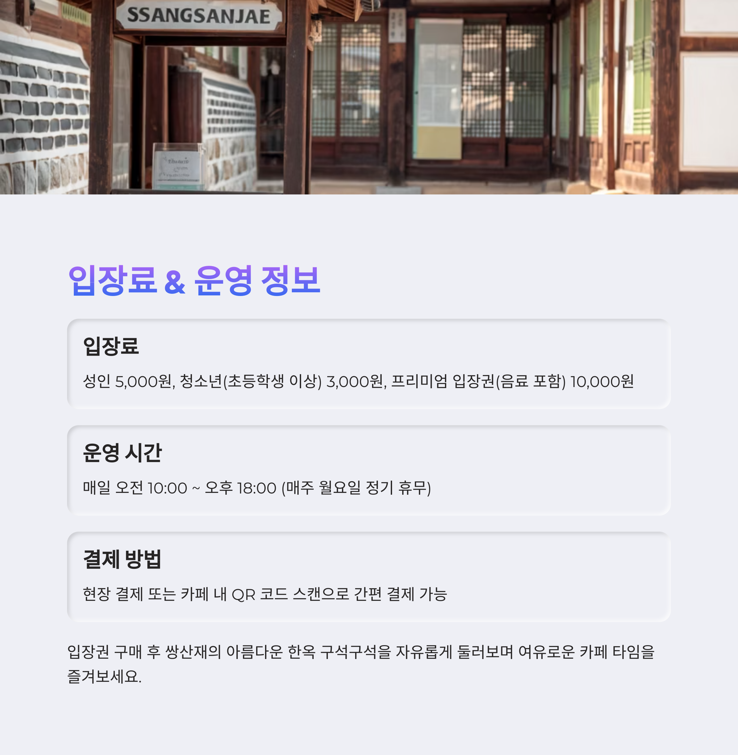 - 입장권은 카페 내 QR 코드 결제 또는 현장 결제 가능