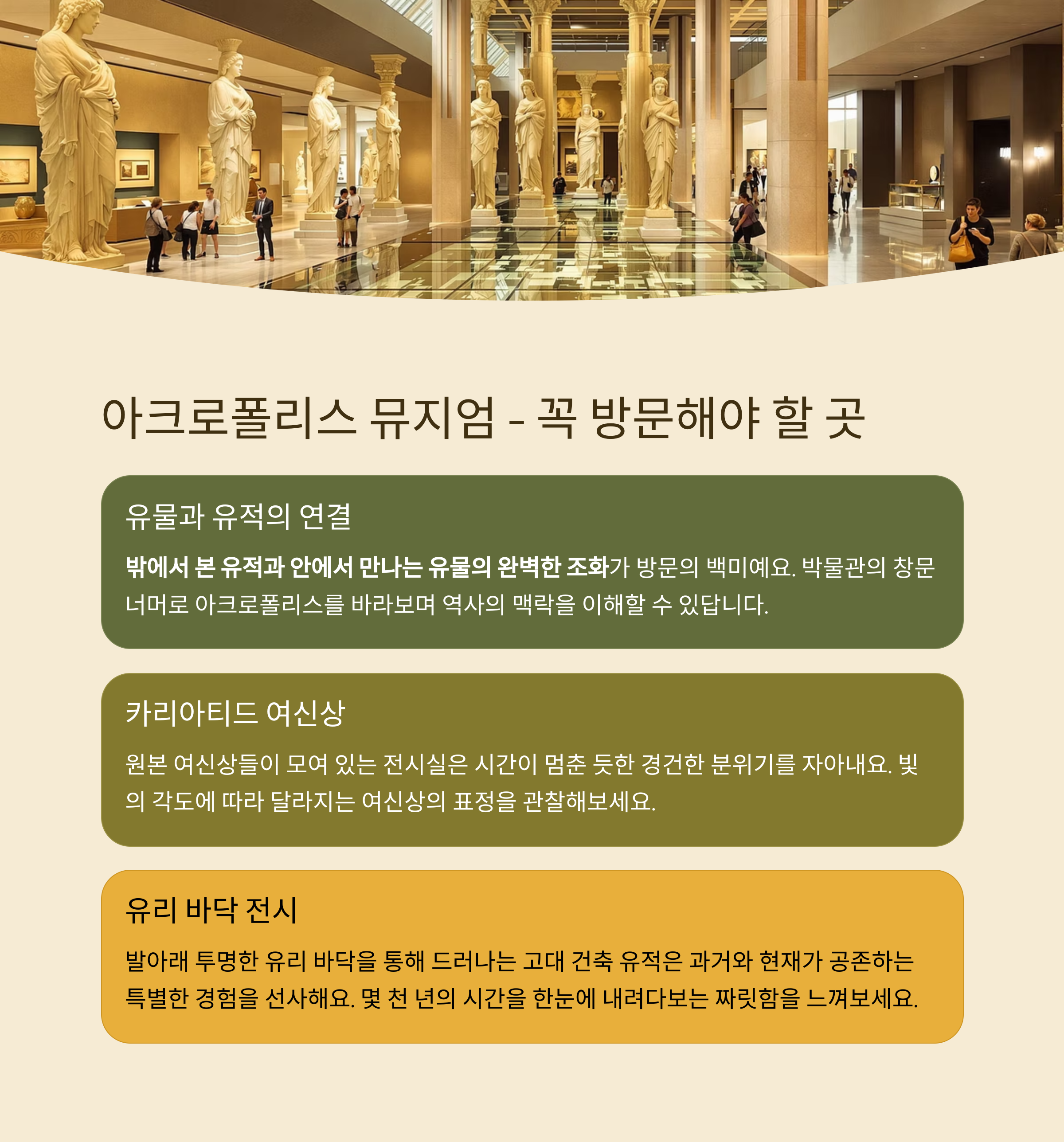 | 아크로폴리스 박물관 | 1시간 | 유물 전시, 실내 감상 장소 |