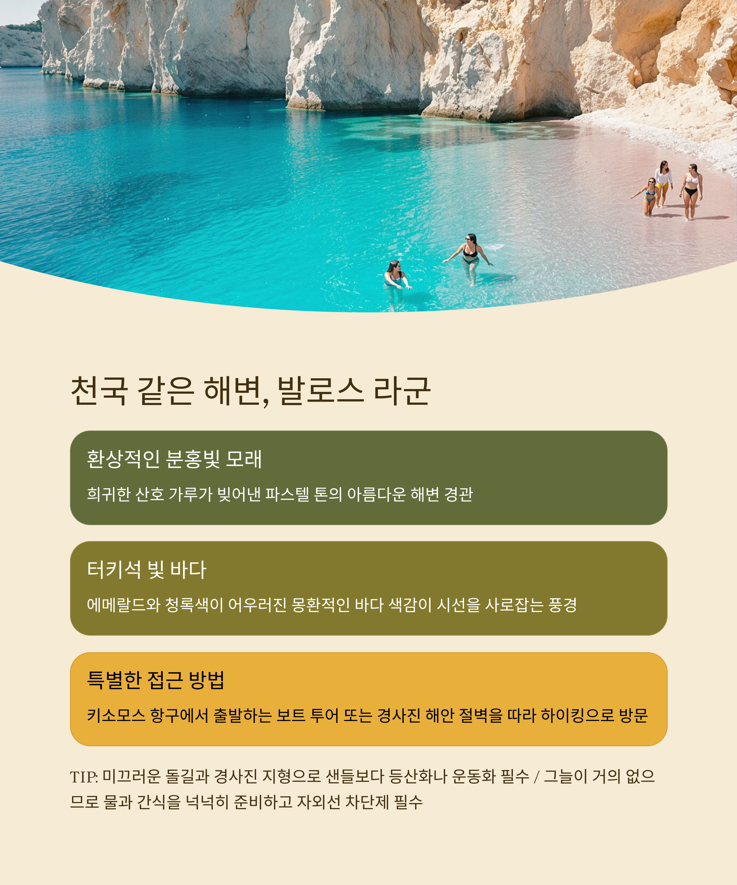 | 활동 | 스노클링, 일광욕, 감성 사진 촬영 |