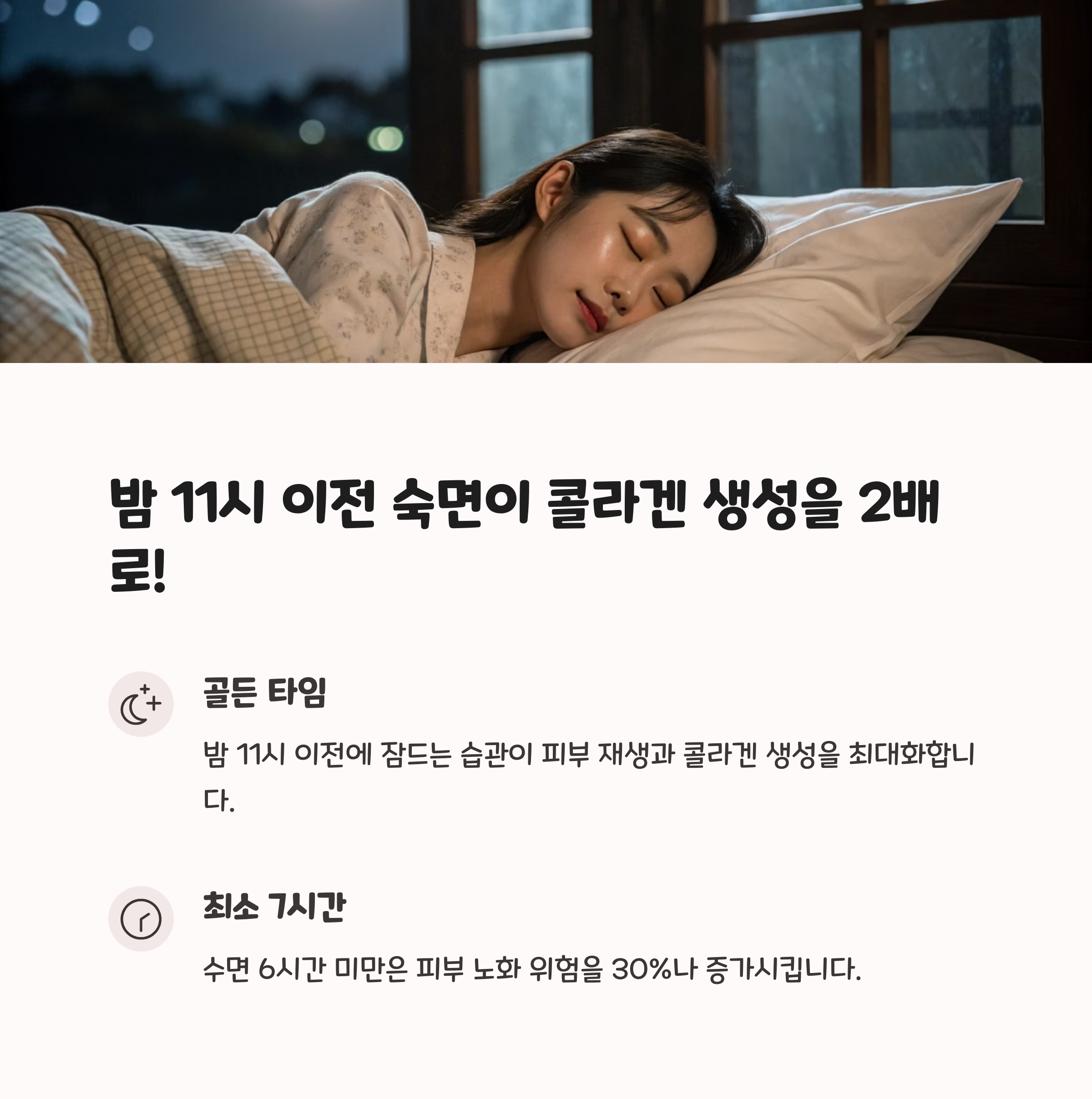 | 밤 11시 이전 취침, 깊은 수면 확보 | 매일 선크림, 모자 착용, 음영 찾기 | 설탕 줄이고 항산화 식품 섭취 |