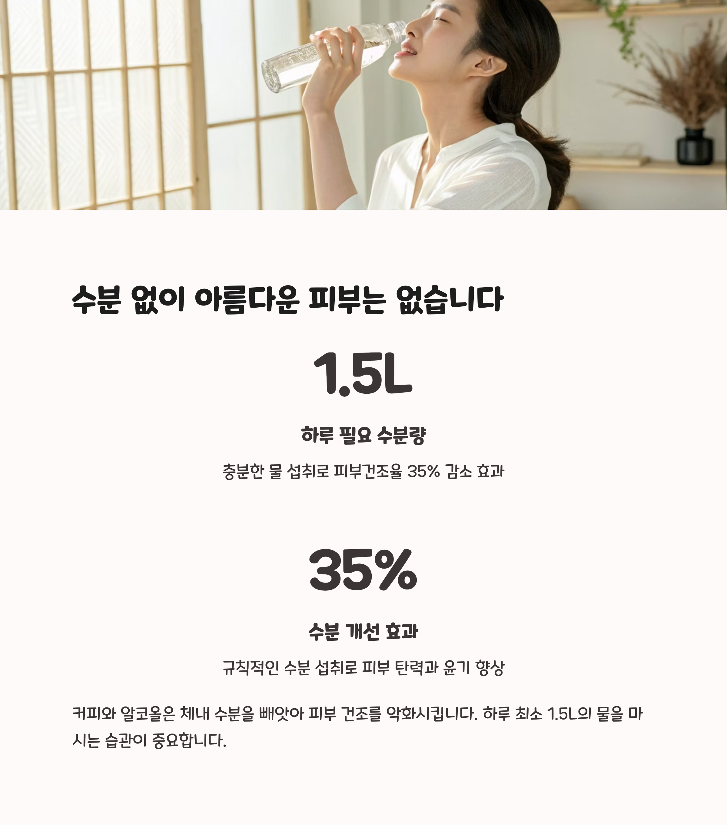 밤 11시 이전 취침, 깊은 수면 확보 | 매일 선크림, 모자 착용, 음영 찾기 | 설탕 줄이고 항산화 식품 섭취 |