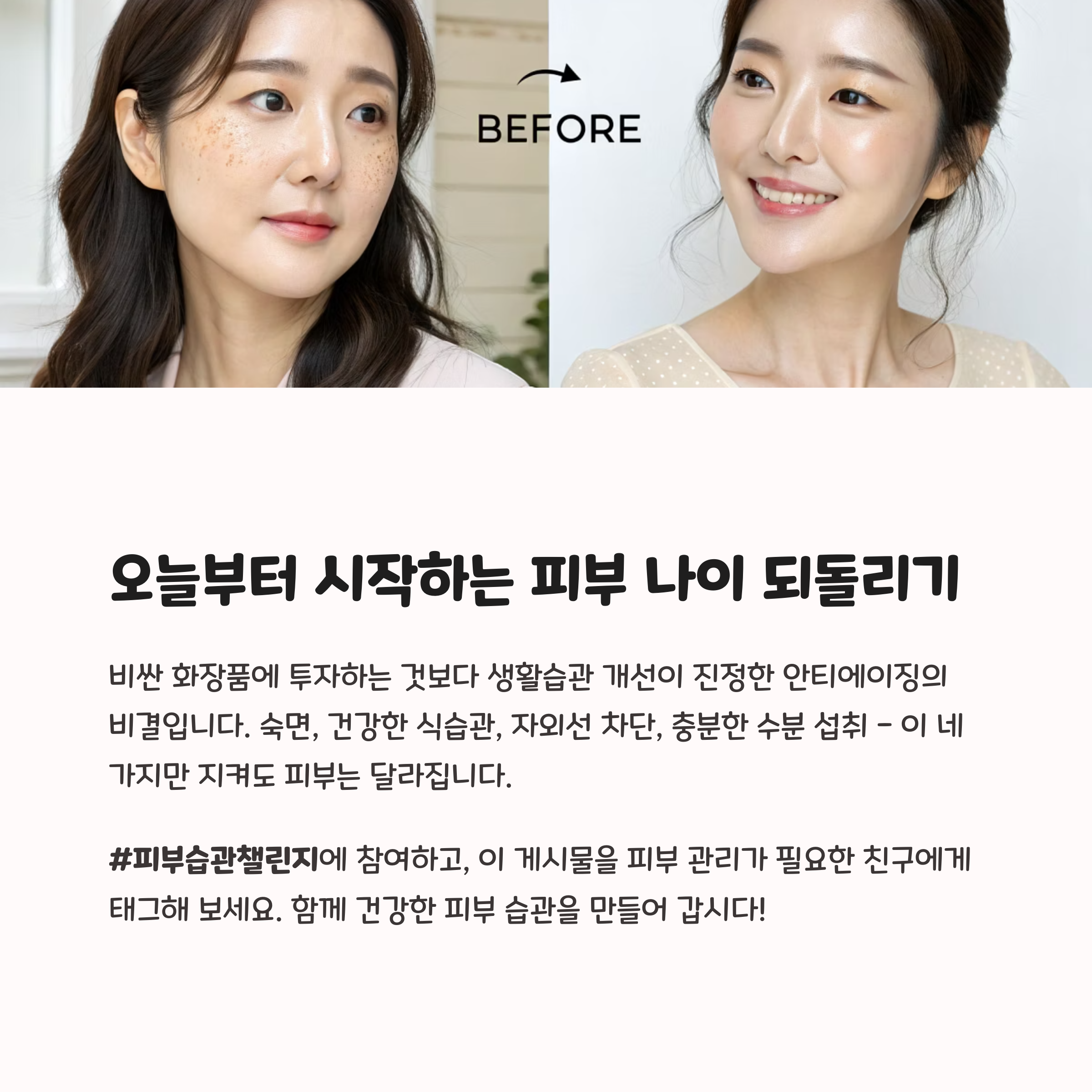 피부 나이를 되돌리기 위해 실천 중인 생활습관이 있다면 댓글로 공유해주세요! 당신의 루틴이 다른 사람에겐 큰 힌트가 될 수 있습니다.