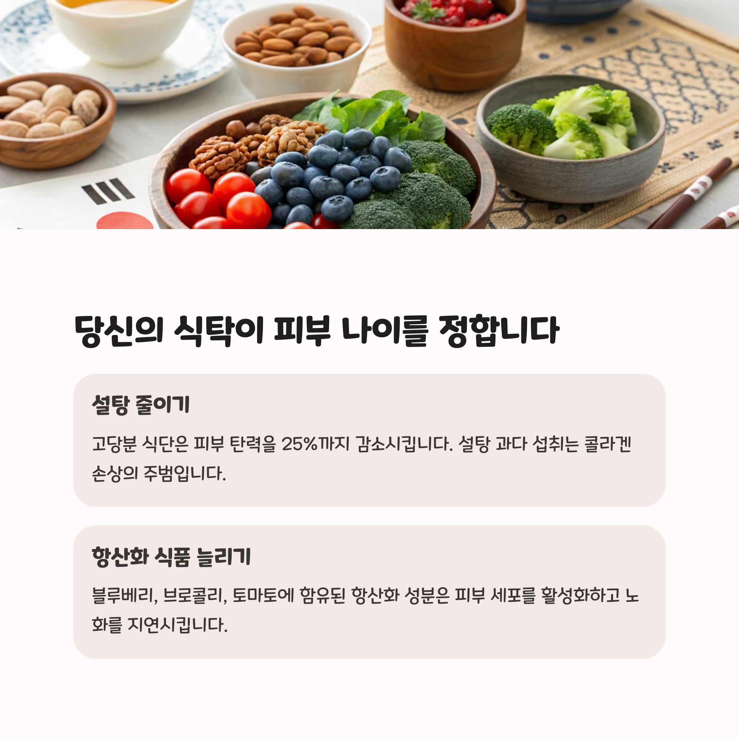 피부 노화의 또 다른 주범은 바로 설탕과 자외선입니다. 설탕은 콜라겐을 파괴</strong하고, 자외선은 피부 탄력을 떨어뜨리는 광노화를 유발합니다. 가공당 섭취를 줄이고, 선크림을 생활화하는 것만으로도 눈에 띄는 변화가 생깁니다. 여기에 항산화 식품을 더하면 금상첨화입니다.