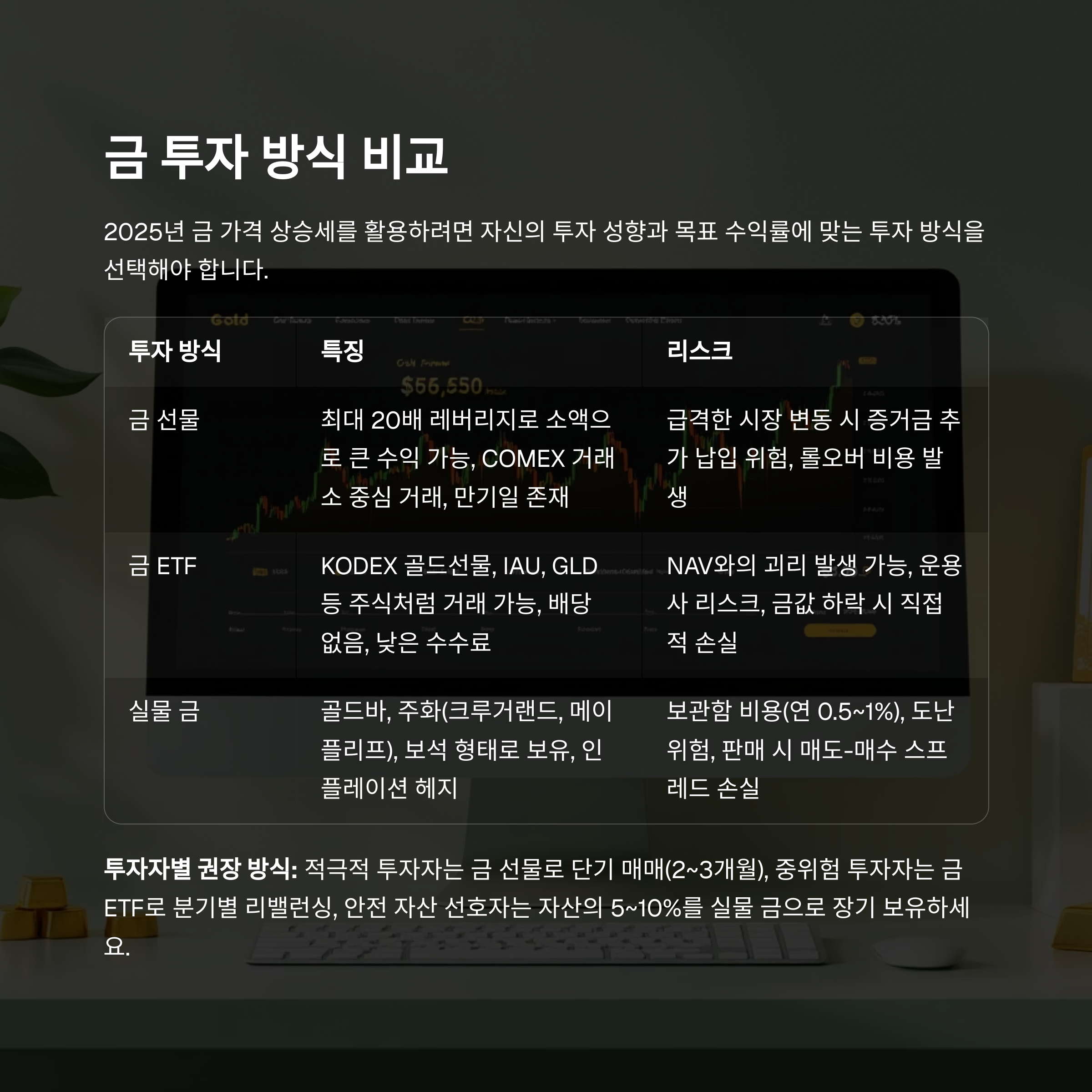 핵심: 단기 수익은 금 선물, 중장기 보존은 금 ETF 또는 실물 금이 적합해요