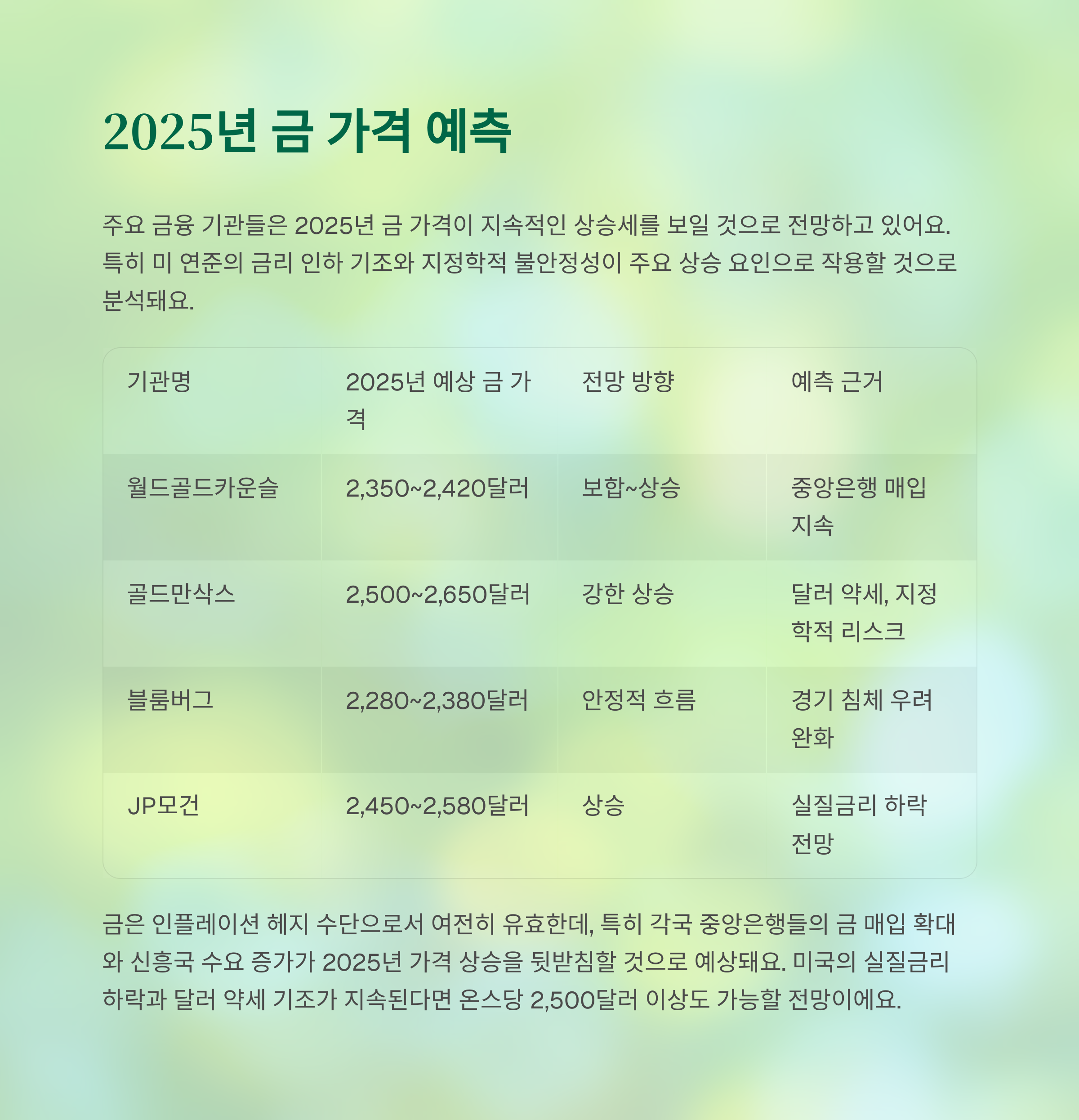 기관명 2025년 예상 평균 금 가격 전망 방향