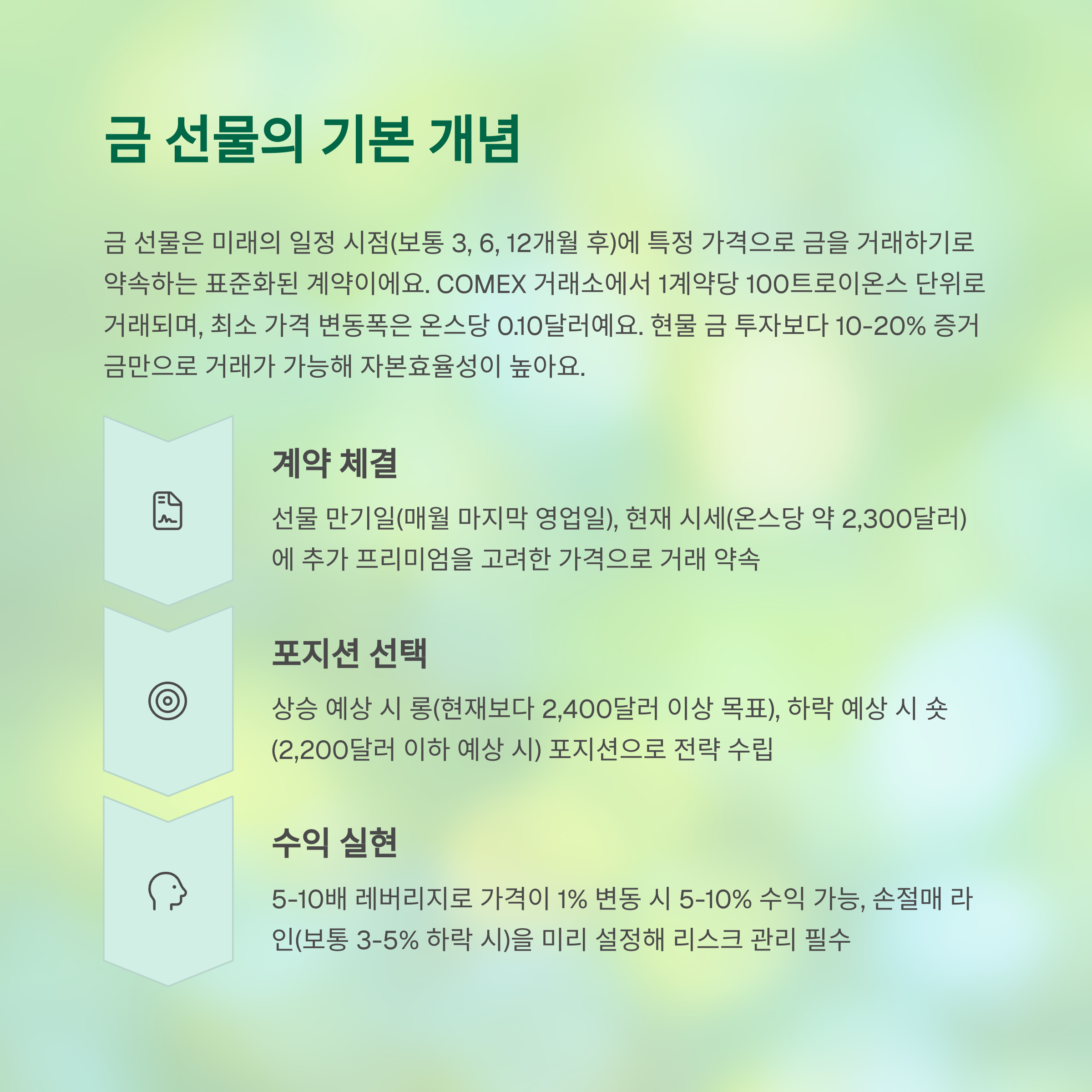금 선물은 미래의 일정 시점에 특정 가격으로 금을 거래하기로 약속하는 계약이에요