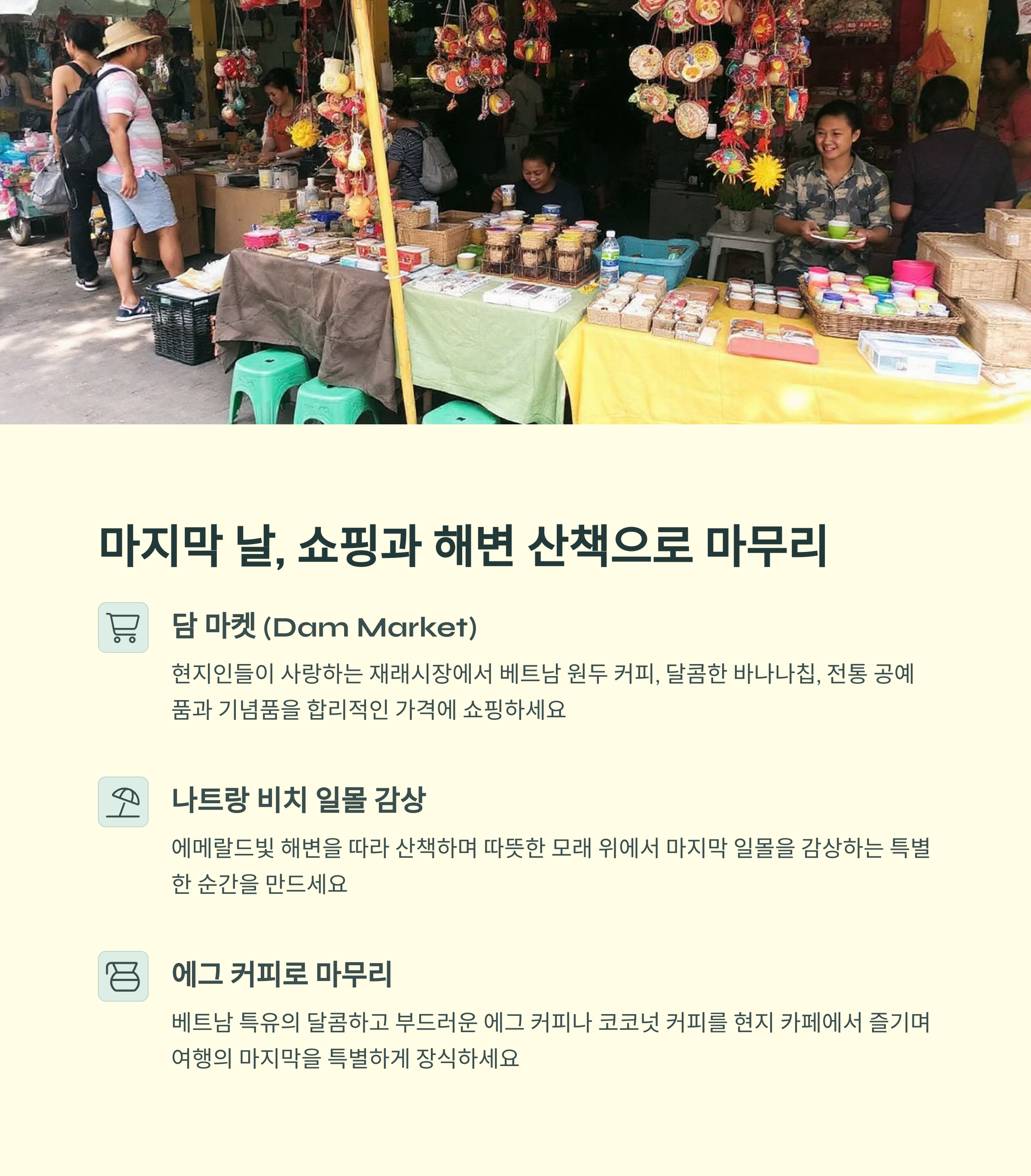 | 4일차 | 쇼핑+해변 마무리 | 다소안 마켓, 카페 |
