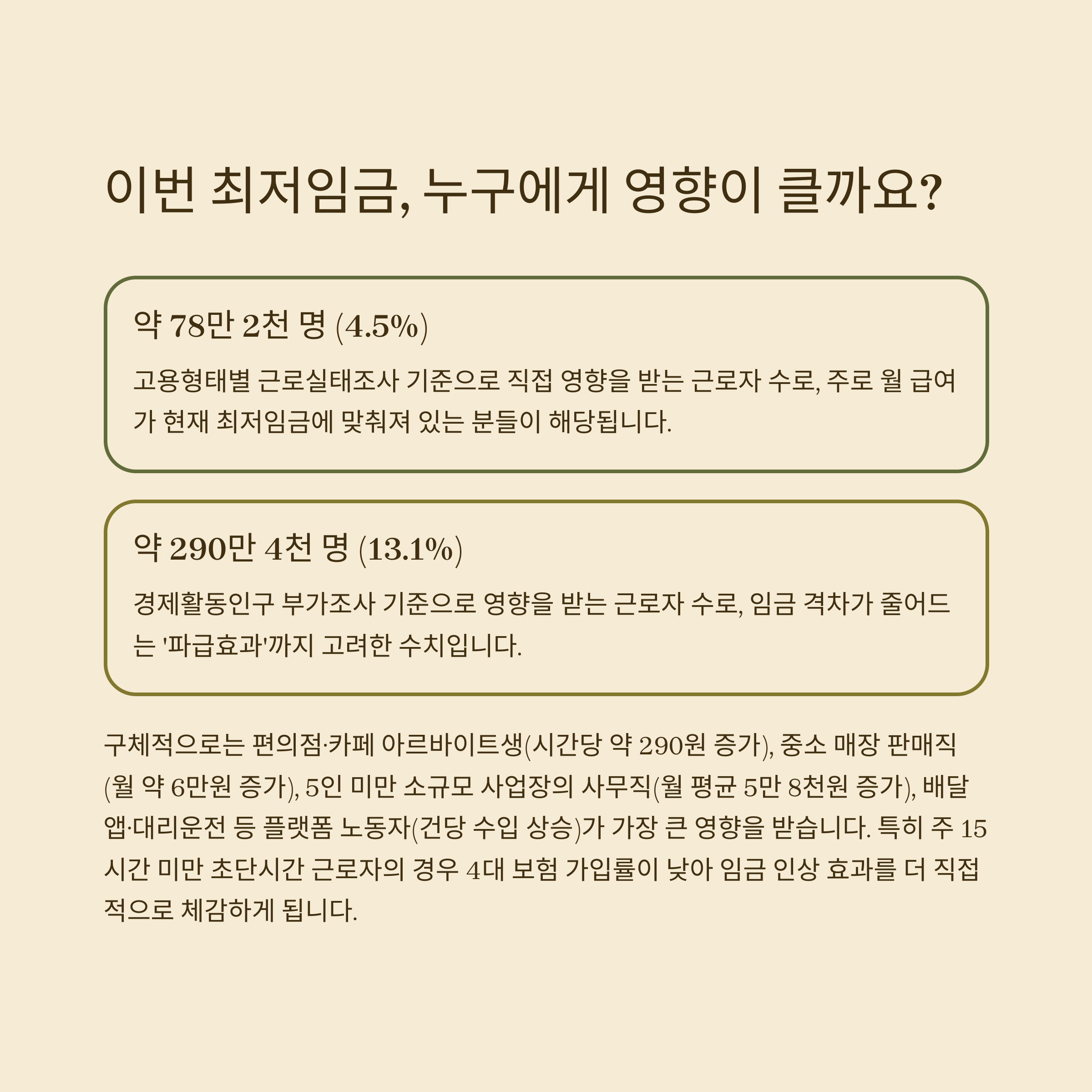 최저임금 인상으로 직접 영향을 받는 근로자는 약 78만 2천 명(4.5%),