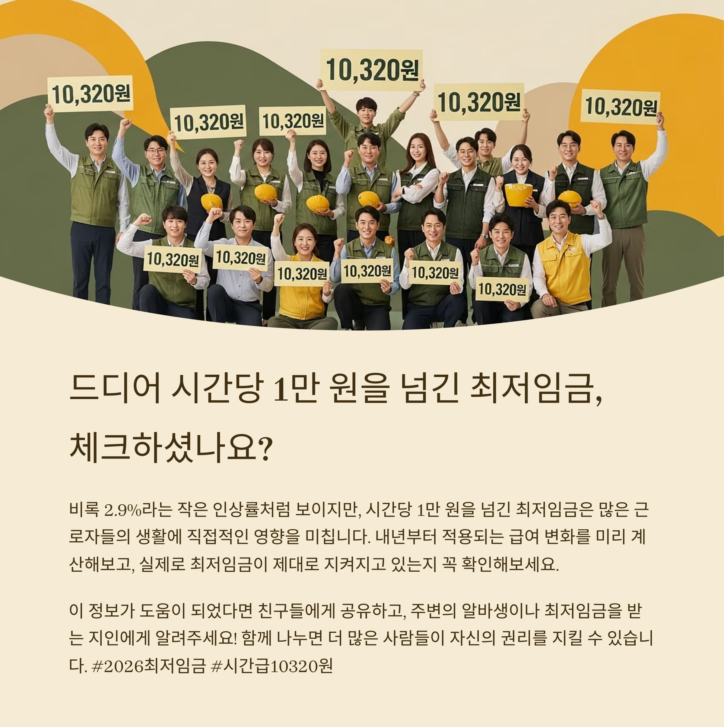 시간당 1만 320원, 올해보다 **290원 인상(2.9%)**된 수치예요.