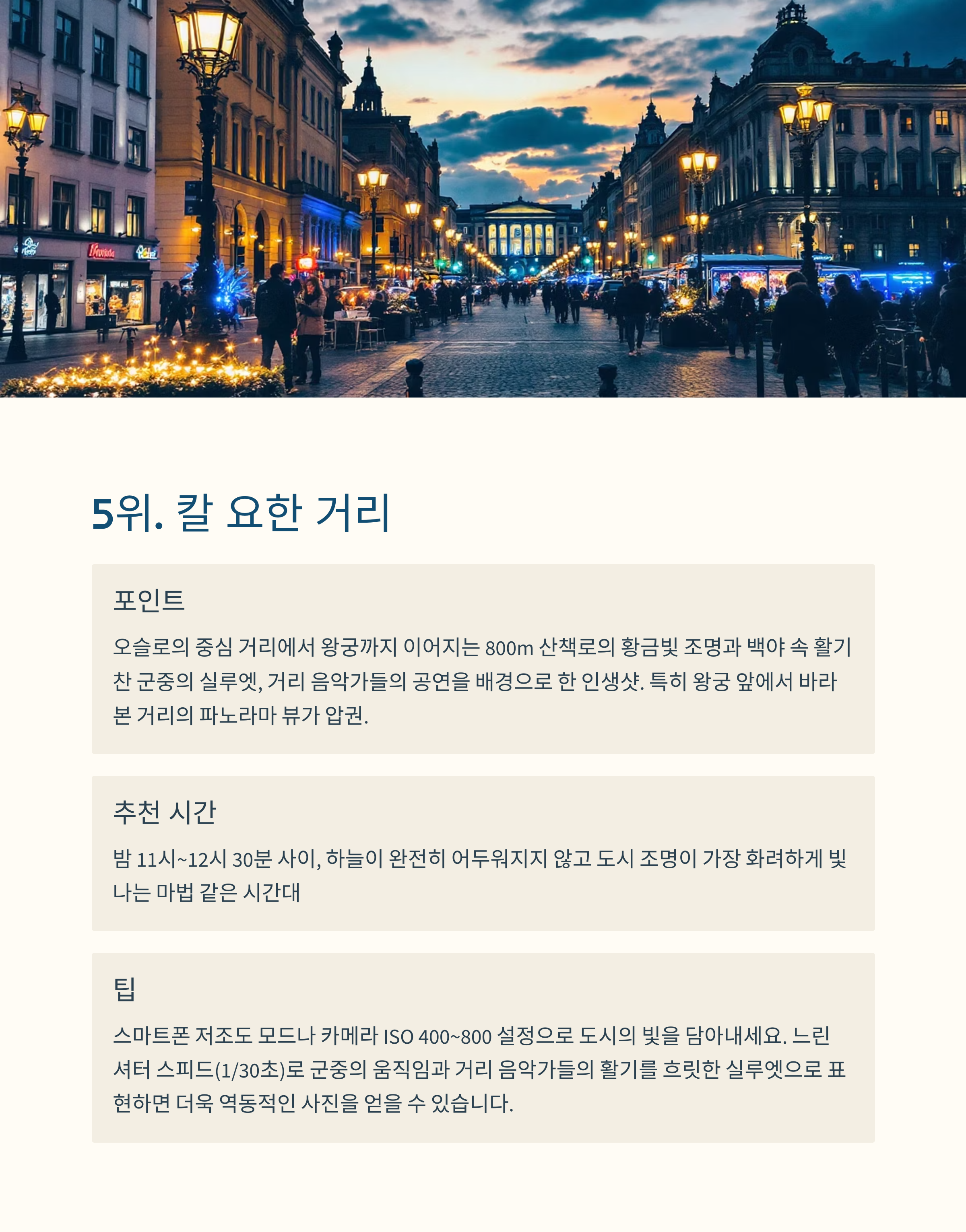 | 포인트 | 거리 조명 + 군중 실루엣 + 왕궁 앞 노을 |