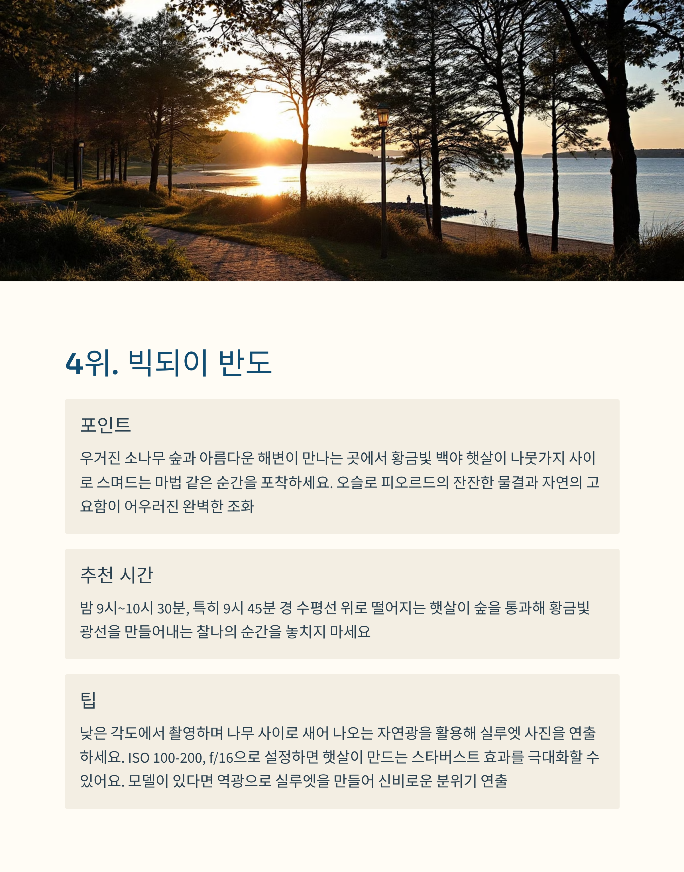 | 포인트 | 해변가·나무 그늘 길 + 저녁 햇살 |