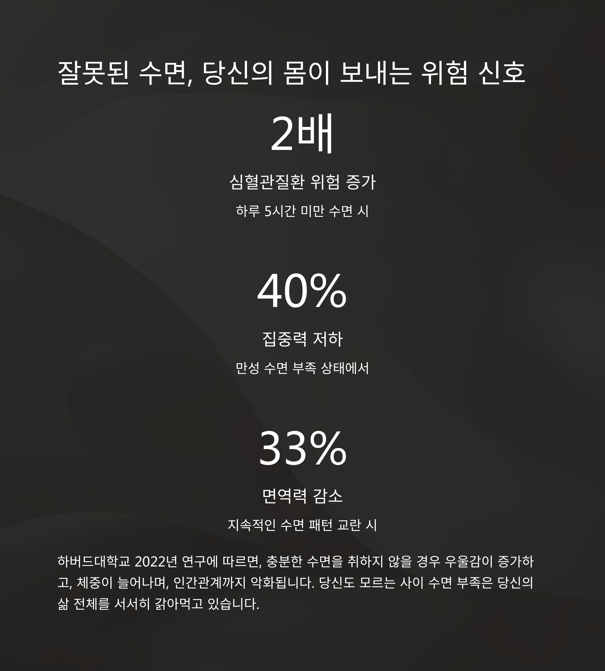 "집중력 저하, 면역력 약화, 만성 피로까지 다양한 부작용을 불러옵니다."