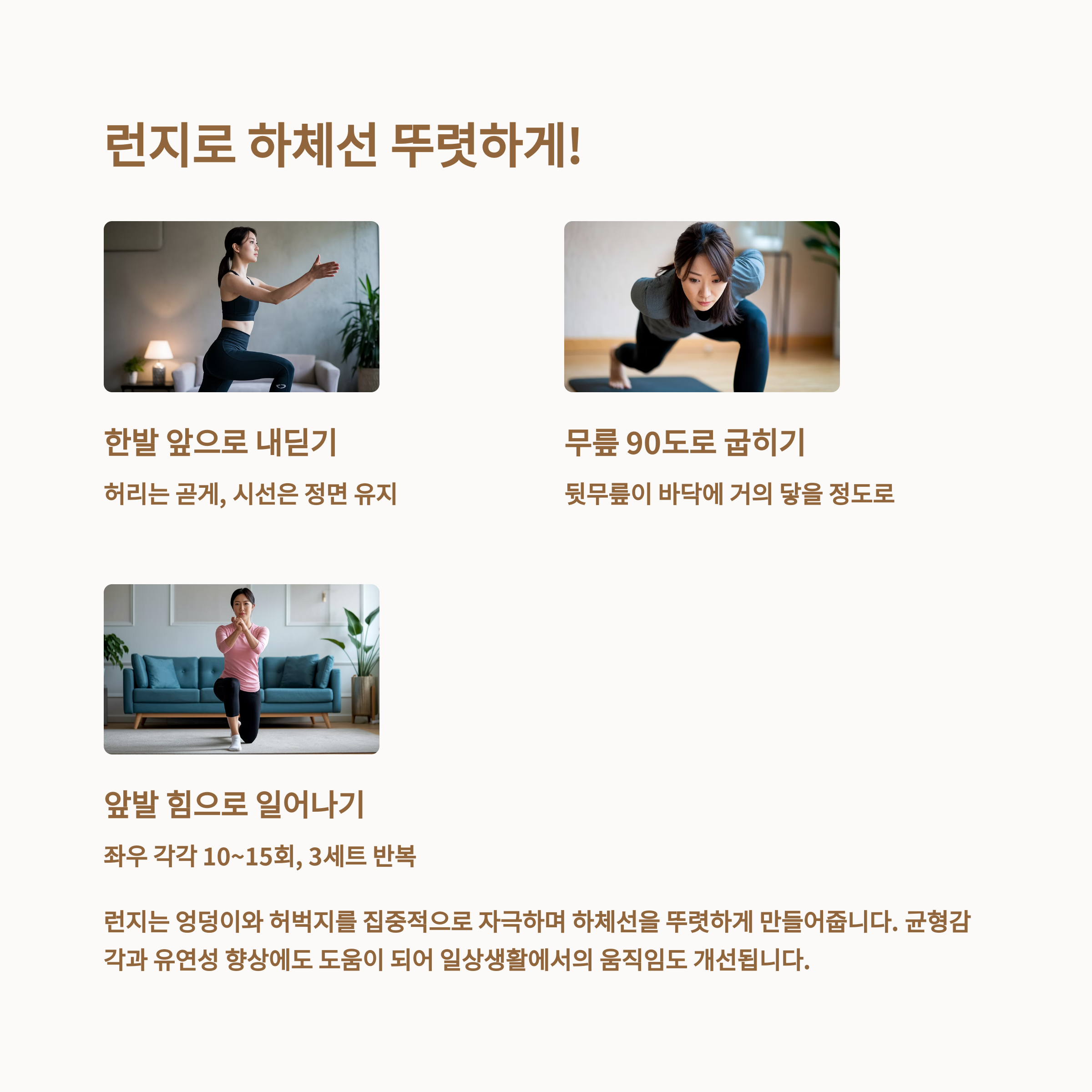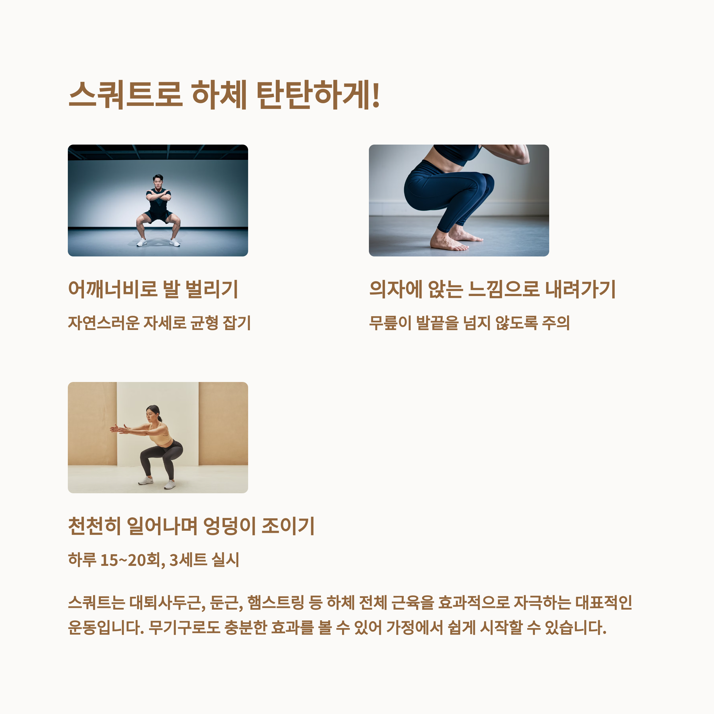 하체 근력 운동인 스쿼트, 런지, 힙브릿지가 대표적입니다. 체중을 이용한 운동이라 장소 제약도 없고, 초보자도 쉽게 시작할 수 있어요.