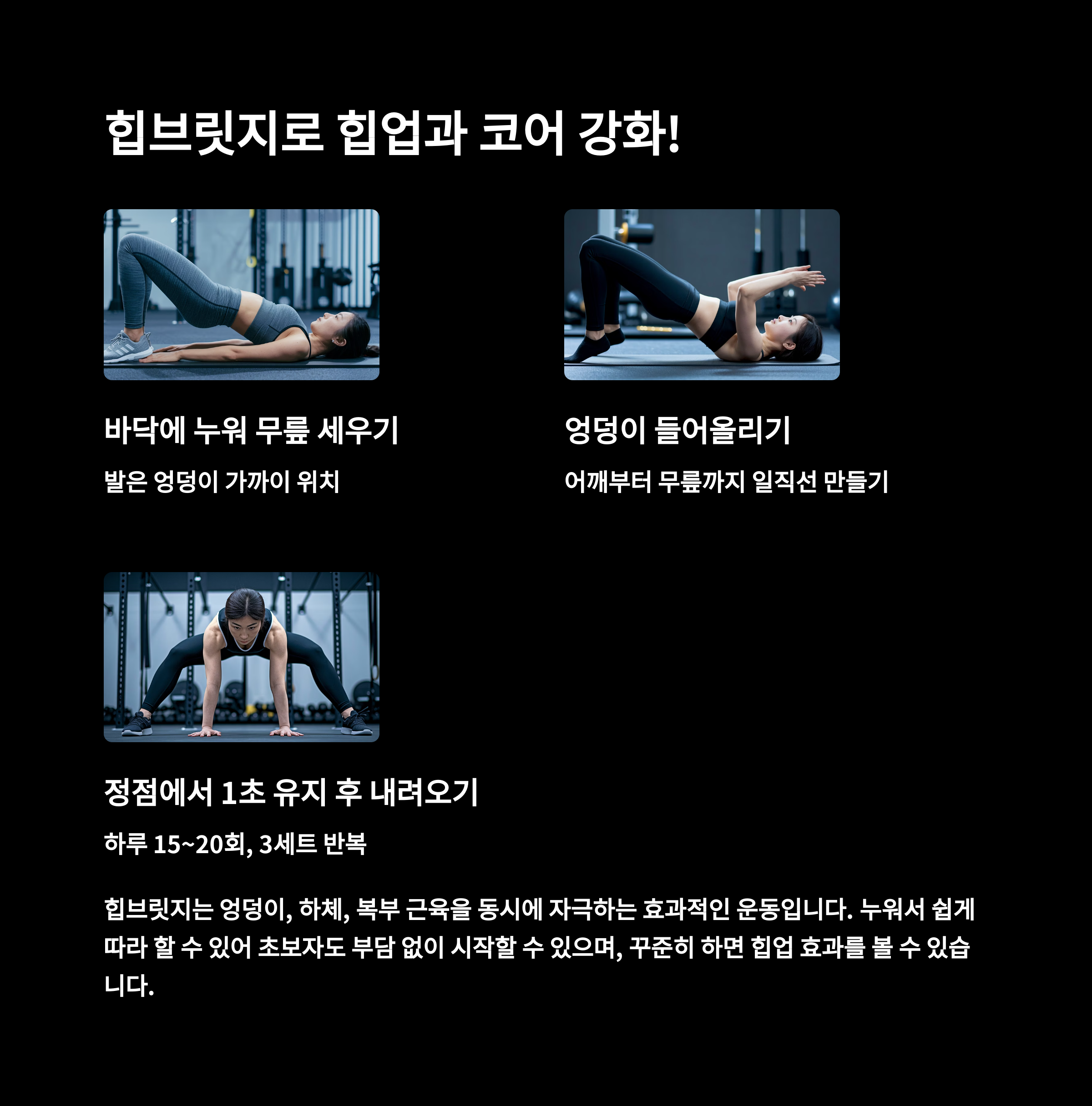 | 자세 불균형, 운동 부족, 순환 문제 등 복합 원인 | 홈트레이닝 루틴과 꾸준함으로 충분히 가능 | 스쿼트, 런지, 힙브릿지 등 무기구 근력 운동 |