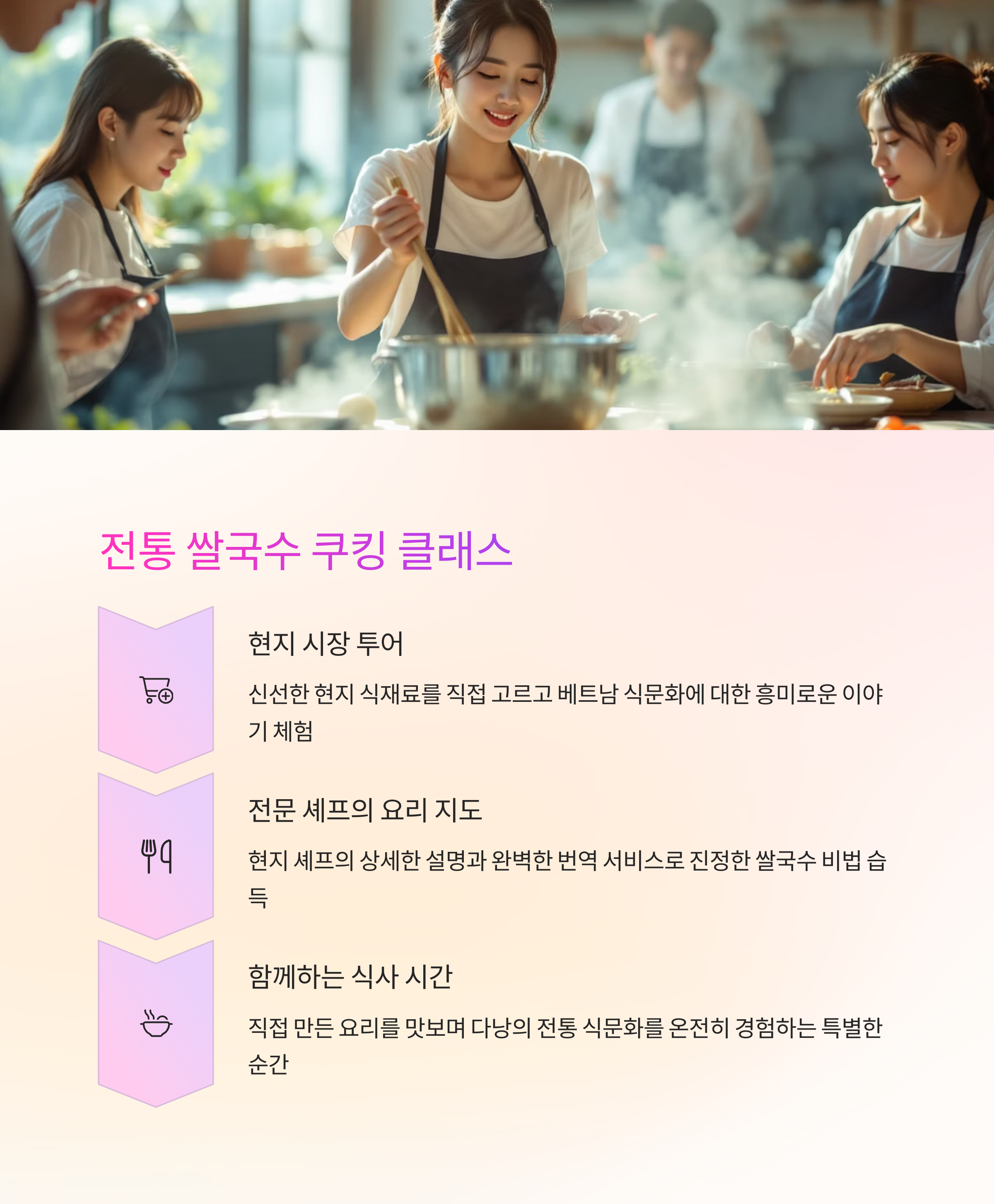 - 시장 투어 → 재료 구매 → 요리 실습 → 직접 식사
