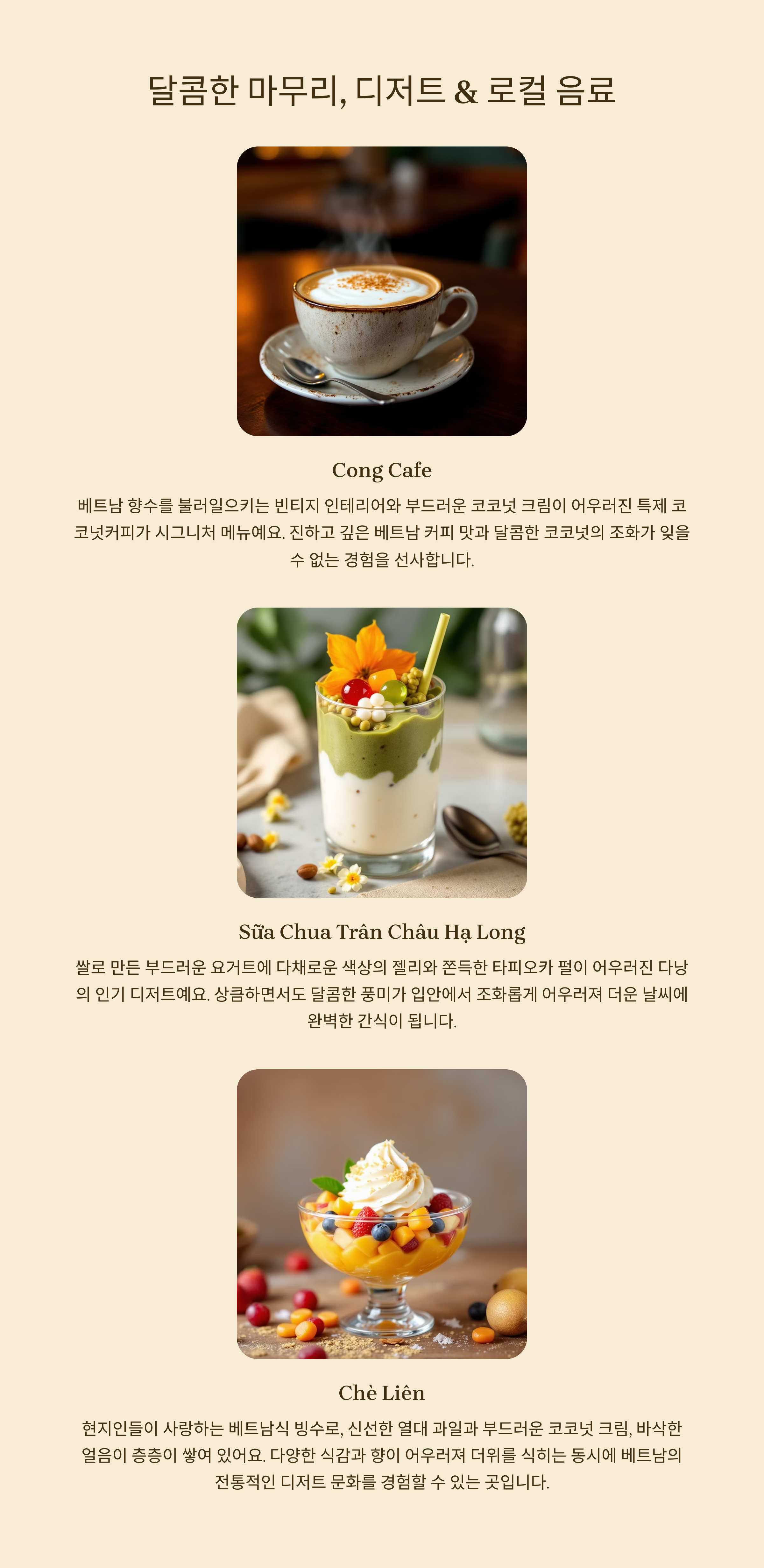 | Chè Liên | 베트남식 빙수 | 다양한 과일+코코넛 베이스 |