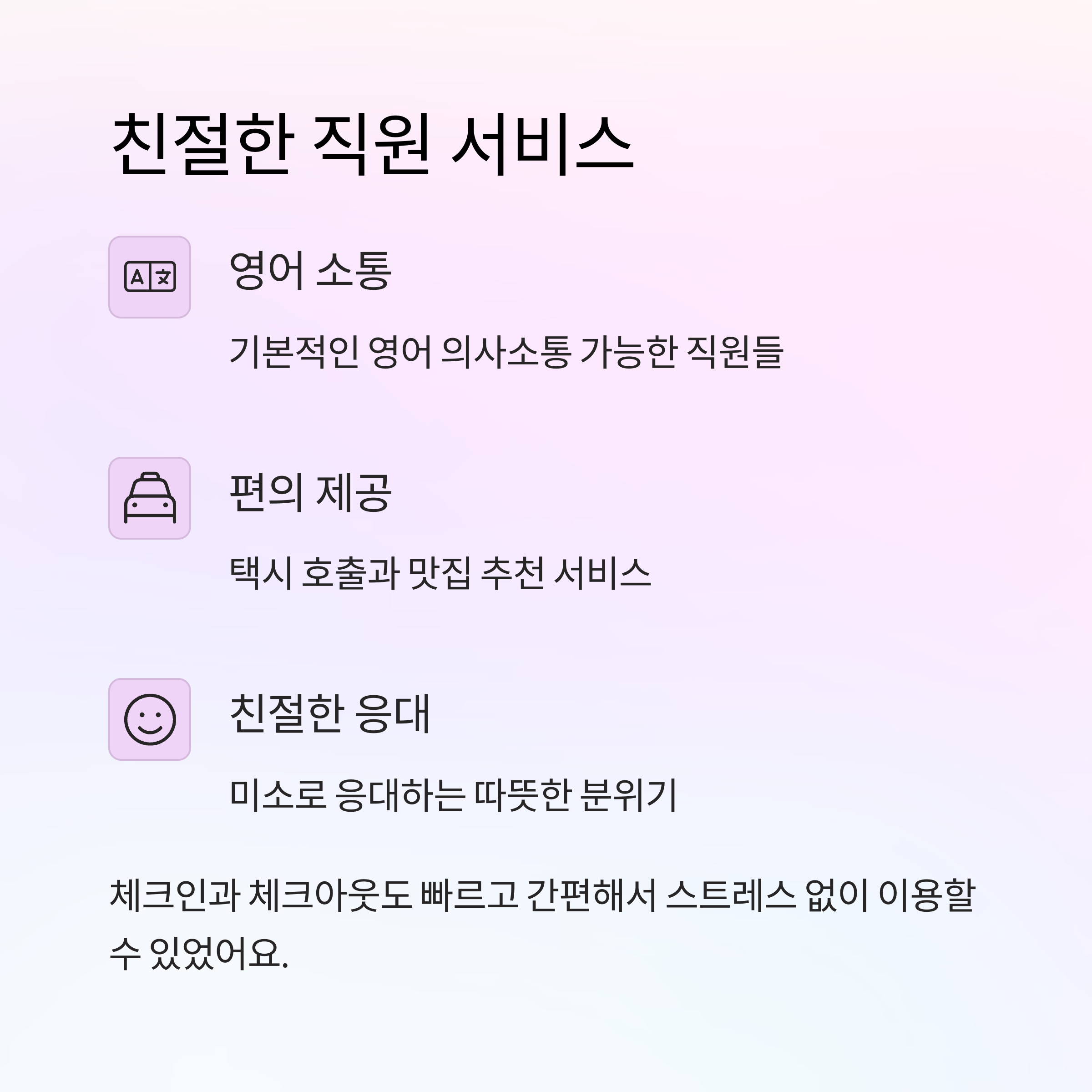 체크인과 체크아웃도 아주 빨라서 스트레스 없이 이용할 수 있었고요.