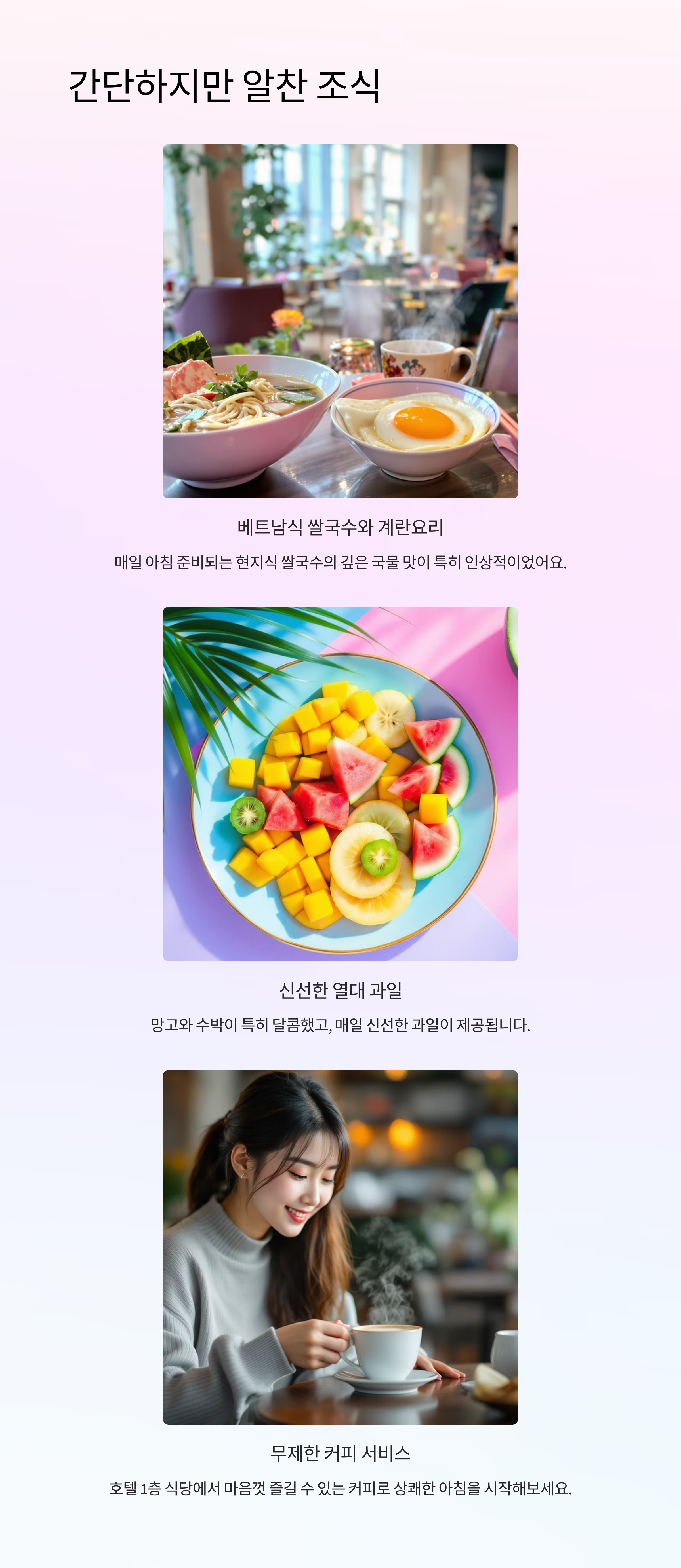 | 조식 포함 여부 | 간단한 식사라도 제공 | 만족 |