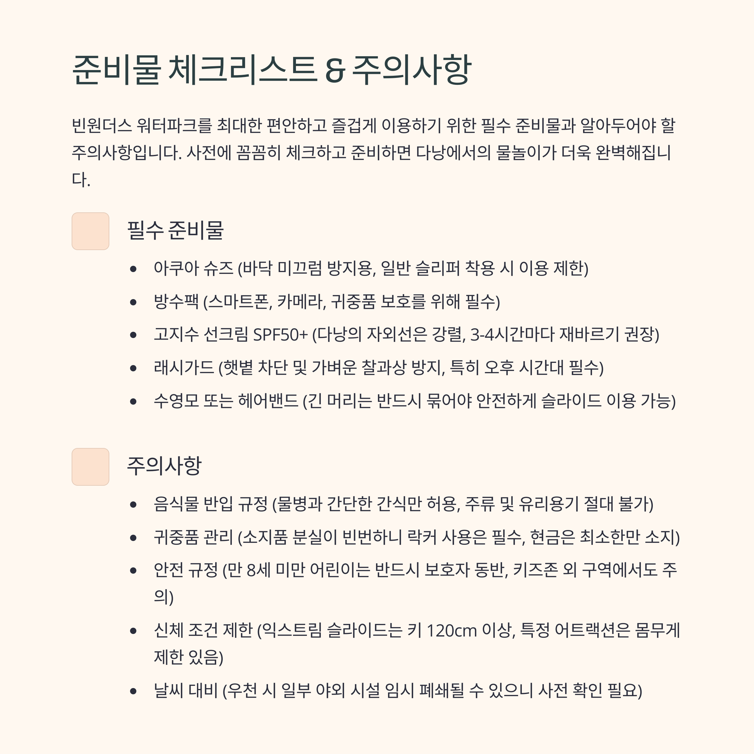 - 아쿠아 슈즈, 방수팩, 선크림은 필수