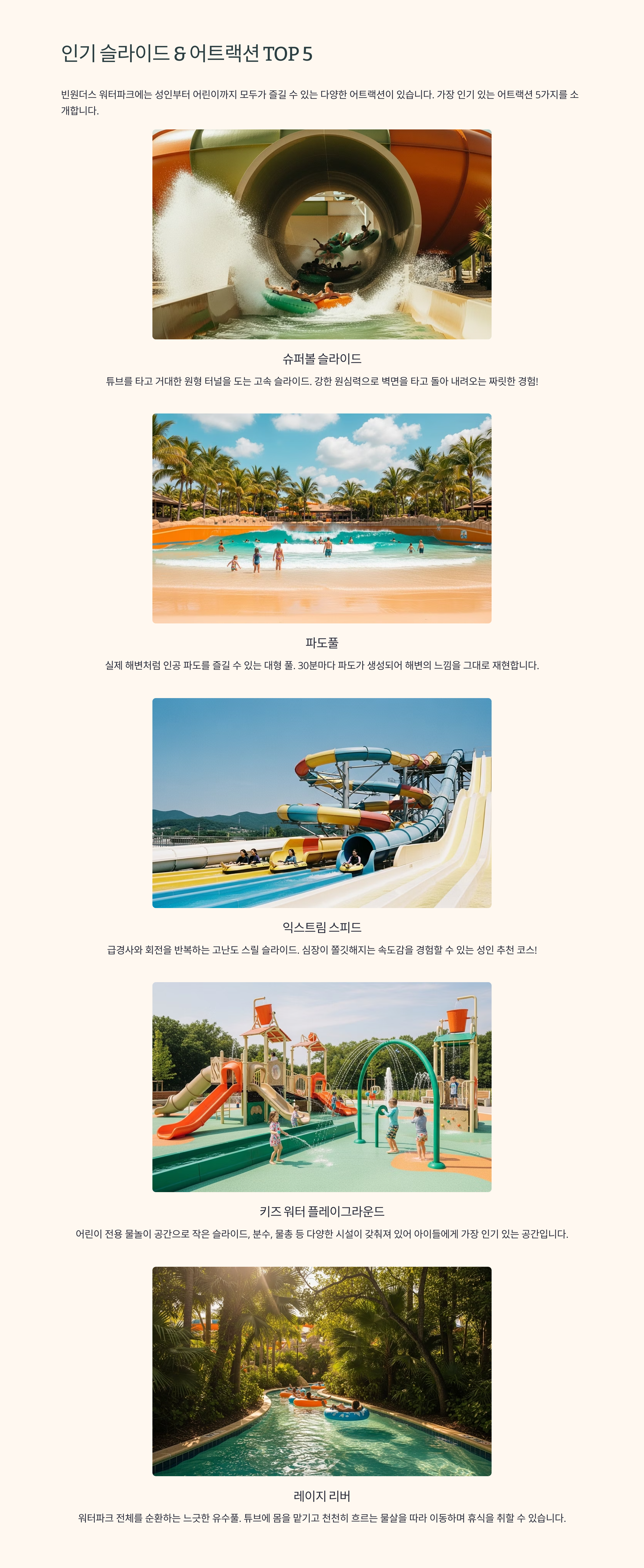 | 키즈 워터존 | 유아 전용 물놀이 존, 미끄럼틀과 물총 등 안전한 놀이 구성 |